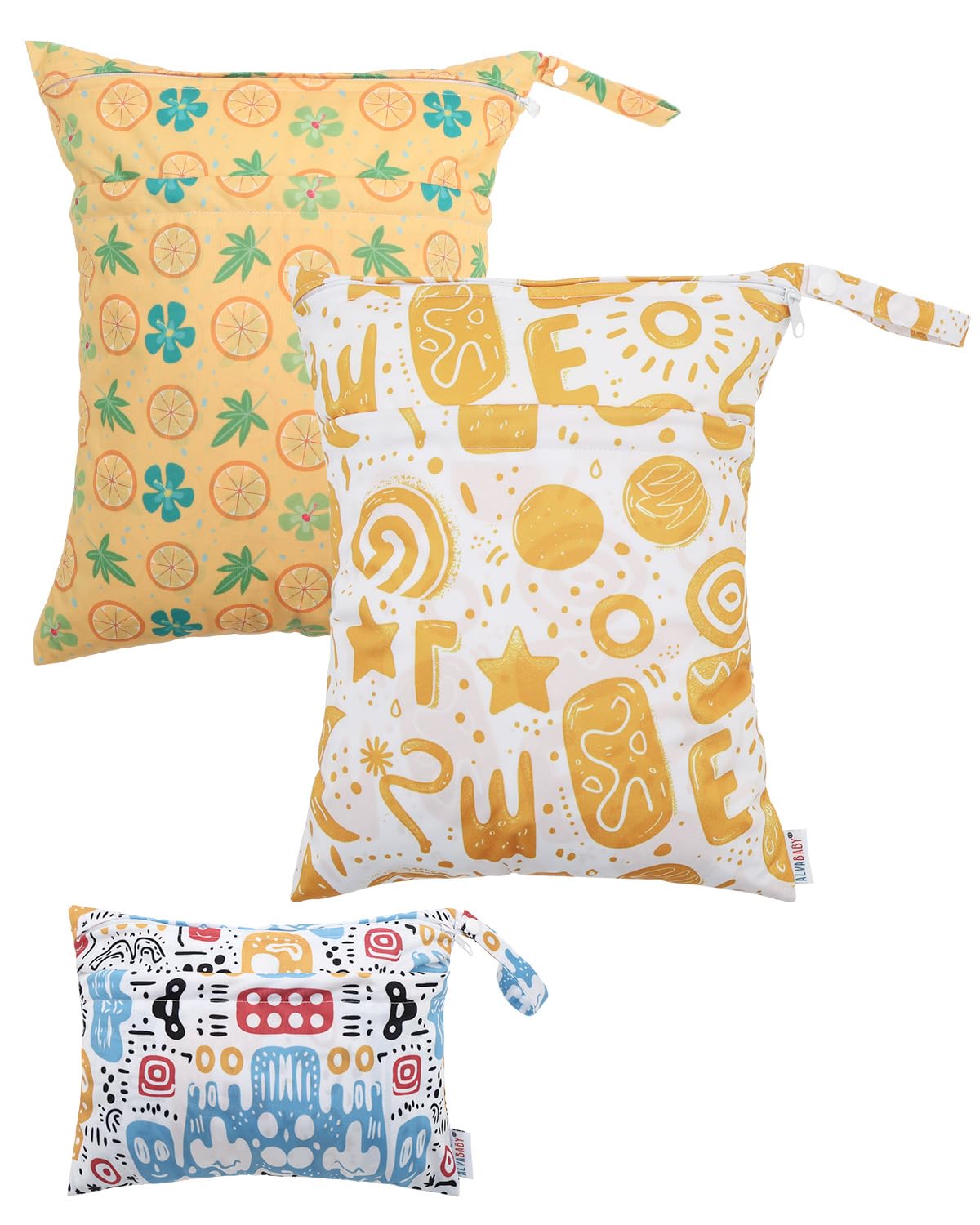 Perfect for Cloth Diapers, Swimsuits & Travel Diaper Wet/Dry Bags, perfect for holding cloth diapers, swimsuits, or gym clothes. These waterproof, lightweight, reusable bags feature two zippered pockets to separate wet and dry items. Easy to carry, ideal for travel or daily use! Features 1.Fashion, Reusable, Waterproof, High quality: A trim and attractive design. wet/dry bag are made from waterproof 100% polyester, put dirty cloth diapers in a wet bag. Comes with SNAP handle for easy carrying or attaching to your diaper bag or stroller. 2.Excellent Dry Wet Separation Bags: They can serve as excellent dry wet separation bags. Because their capacity is large enough, you can bring towels and a series of clothes to change. The most important thing is that when you finish swimming or exercising, wet clothes can be placed in a bag and completely separated from your dry clothes. 3.Enough Space: Large bag: L16''*W13.3'',can hold up to 10-12 diapers; Medium bag: L14.5''*W11.8'', holds up to 8 diapers; Small bag:L11.5''*W9'',can hold 3-4 diapers. Large and medium bag for baby diaper,swimming suits ,clothes, gym clothes and more. Small bag for your toiletries, bits and undergarment,cosmetics, socks and other belongings 4.Multi-functional Bags: A truly wonderful bag that allows you to carry your wet and dry items in the same bag. Carry all your items in one bag while keeping your dry items dry and your wet or soiled items separate. Truly an all in one bag! They can be used as diaper wet dry bags, travel bags, storage bags, cosmetic bags, handbags, wash bag, organizer bags. Also great for swimming suits or other wet items. Warm Reminder 1.lf you hold too much water with the bag, it may leak, because these bags have two pockets, there are stitches in the bottom of the bag. When usingthis bag, we recommend wringing out the moisture from the clothes beforeplacing them in the bag .