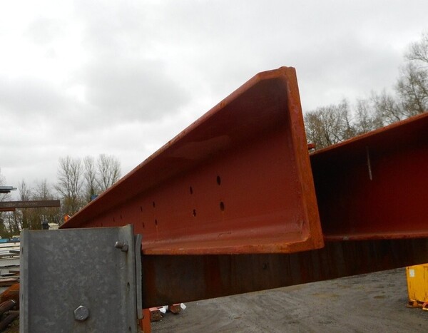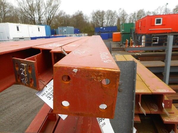 Second hand and has cut out and end plate at one end. The other end has an angle cut and an end plate. Column has been measured to usable length. This column also has holes in the web. Please see pictures for condition.