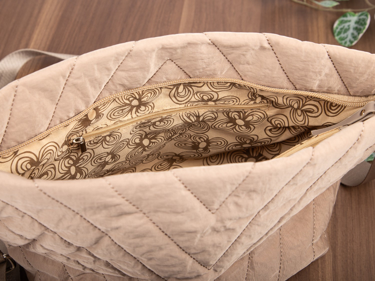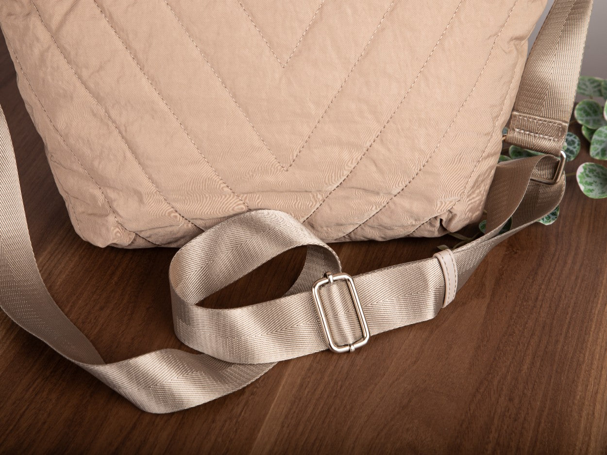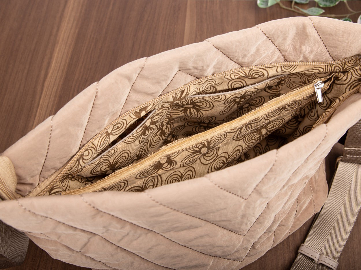 Beige, gesteppte Damen-Schultertasche der Marke Jennifer Jones in mittlerer Größe für den täglichen Gebrauch.