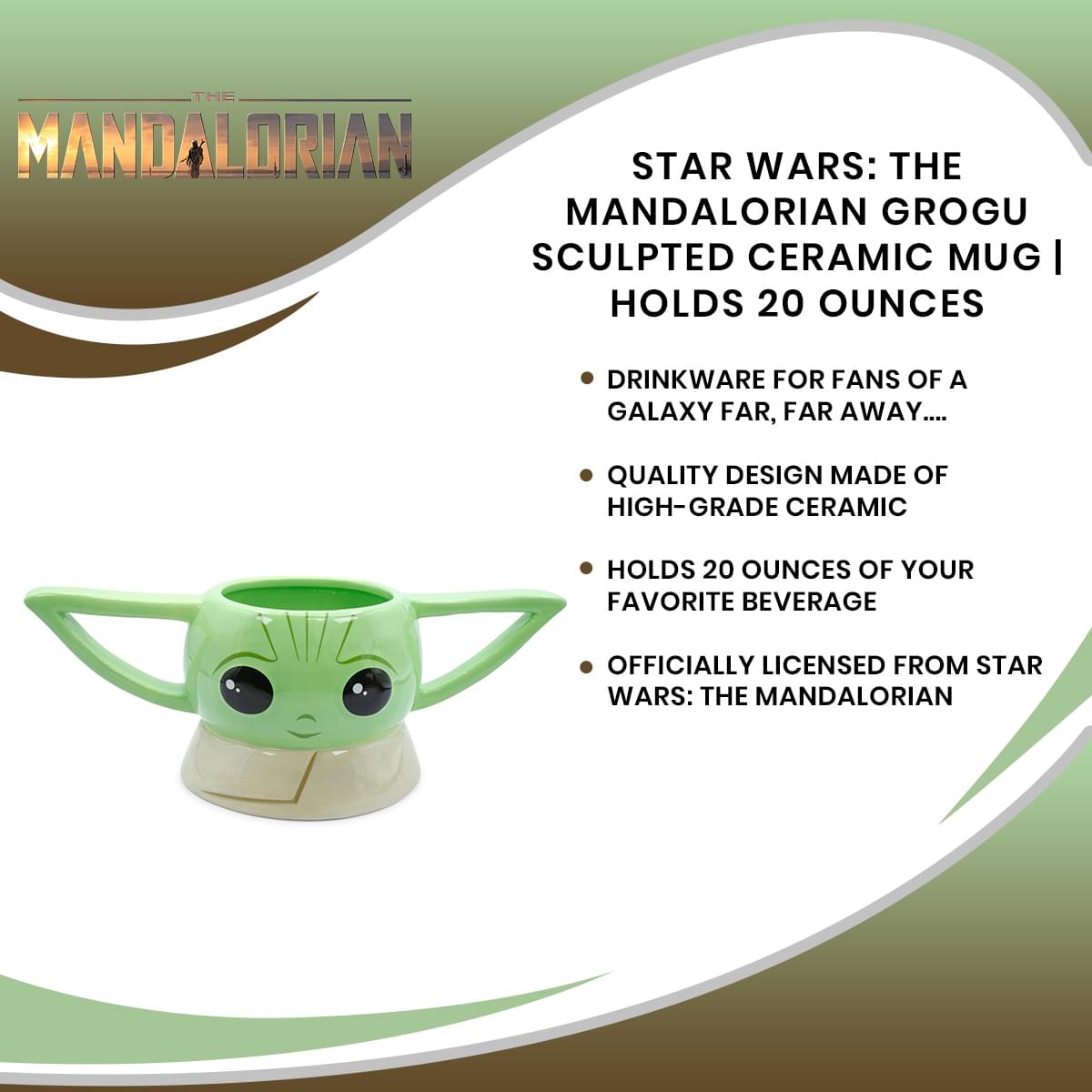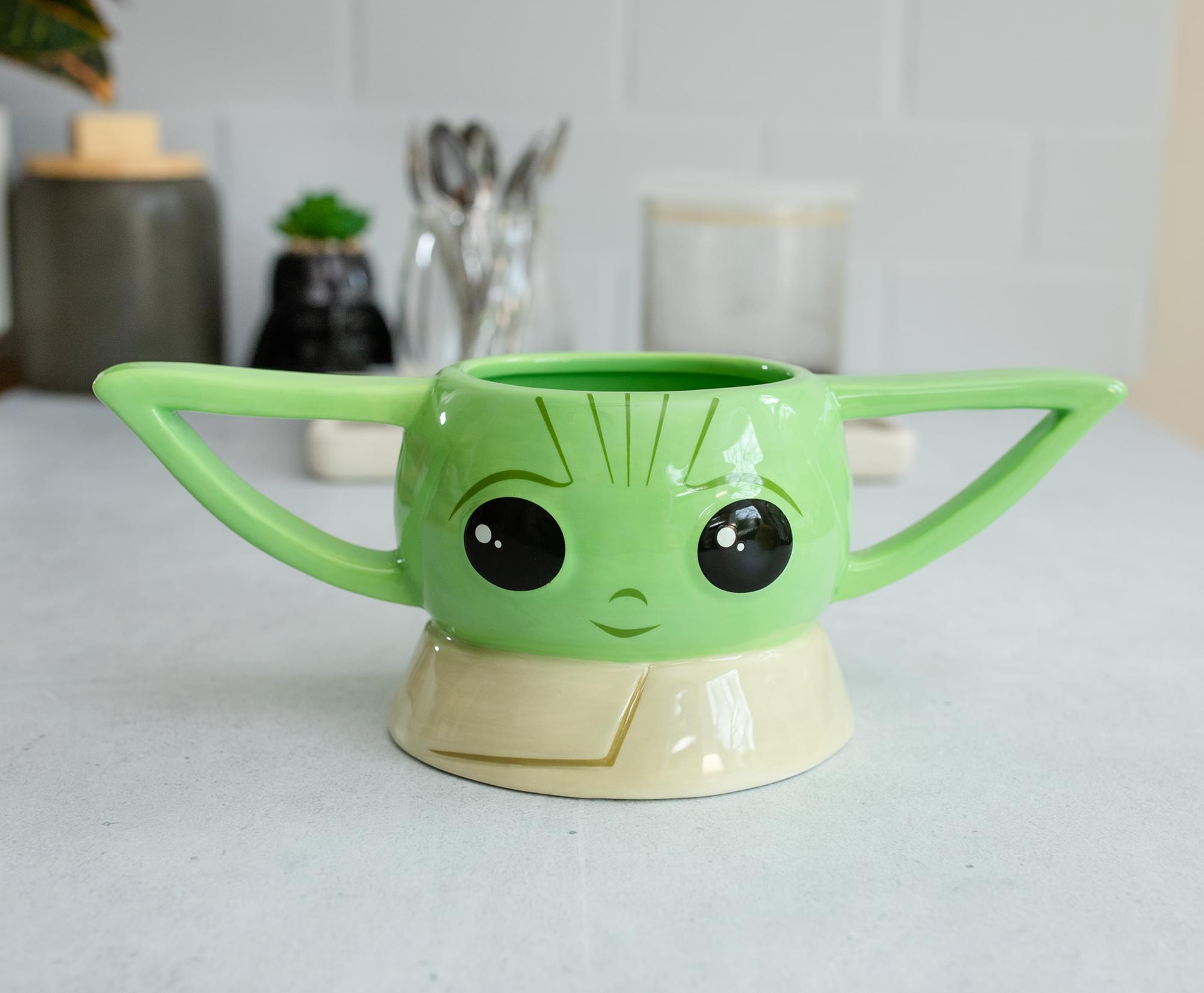 Enjoy a warm brew with Nevarro cookies anywhere in the galaxy with this exclusive coffee mug from Star Wars: The Mandalorian. Grogu is ready to greet your mornings with a smile, reimagined here in this adorable ceramic sculpt. The stylized design features the precious foundling with his characteristic large eyes and floppy ears, which serve as clever handles.