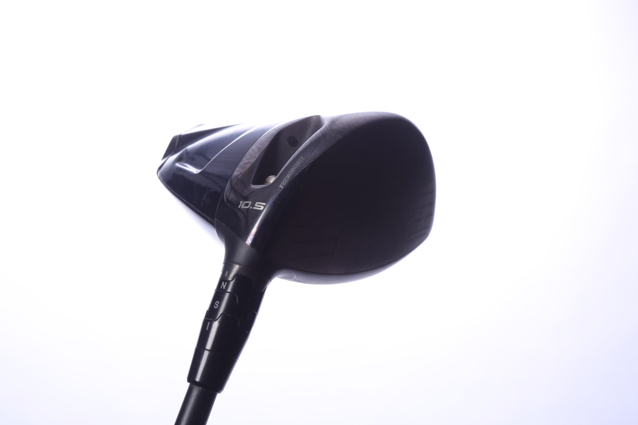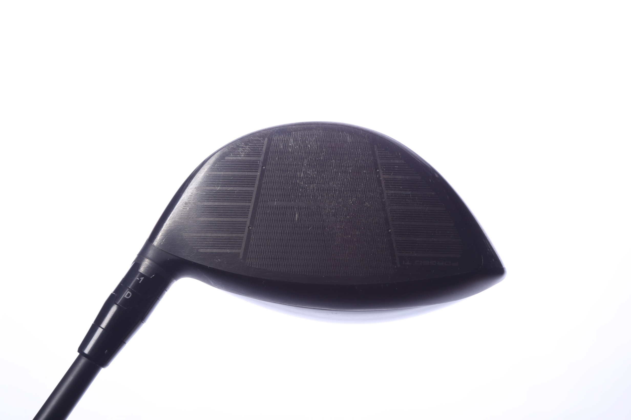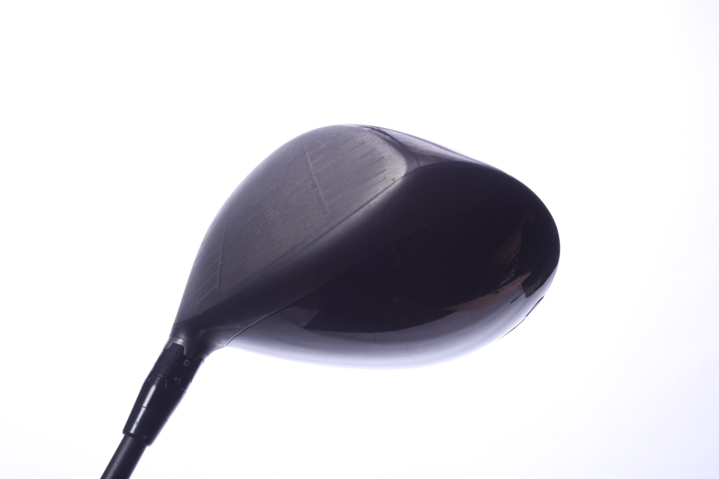 This driver shows light to heavy sole wear from play, noticeable face wear from ball strikes, and minor paint chips/scratches on the head. Overall, it remains in good playing condition.