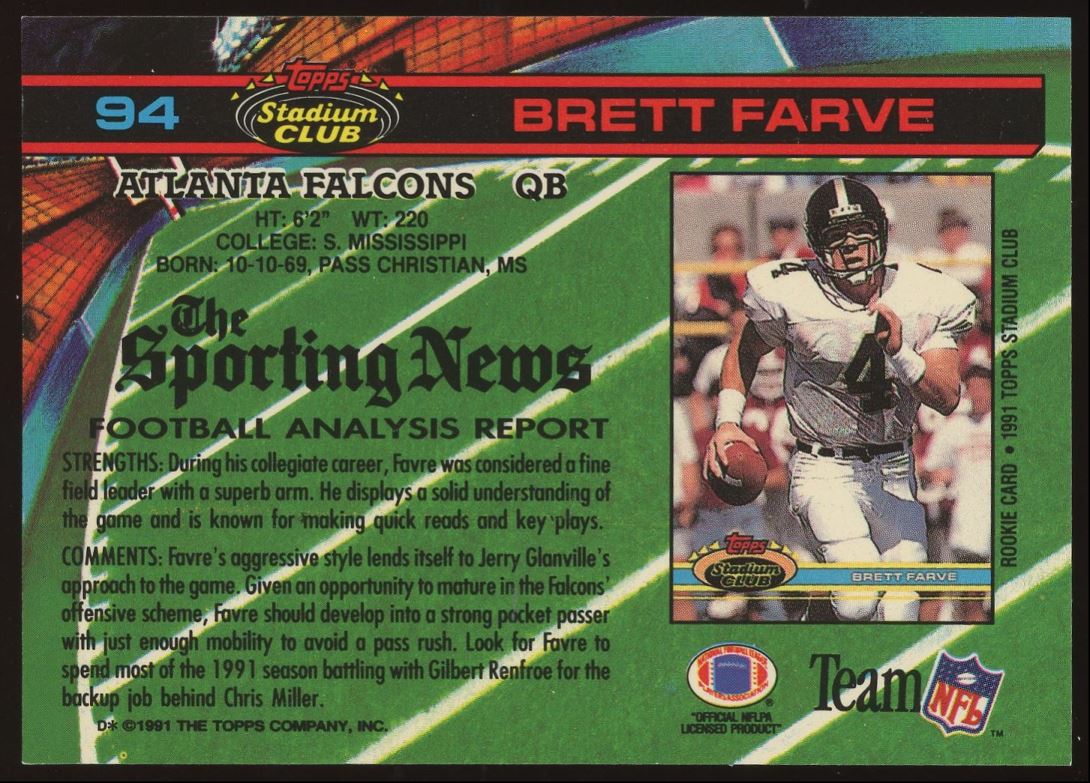 | Brett Favre #94 1991 Topps Stadium Club Rookie Atlanta Falcons |