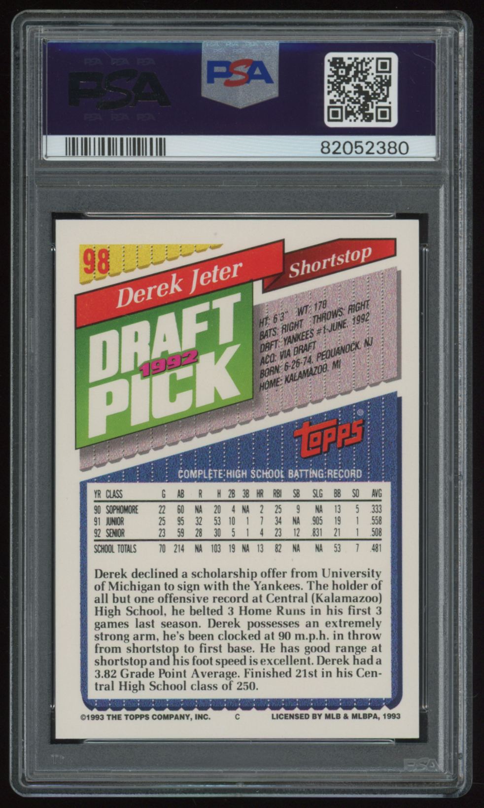 1993 Topps Derek Jeter Rookie PSA 9 New York Yankees #98