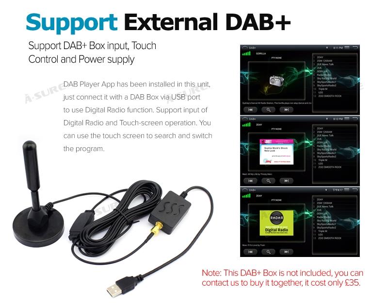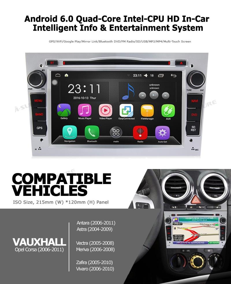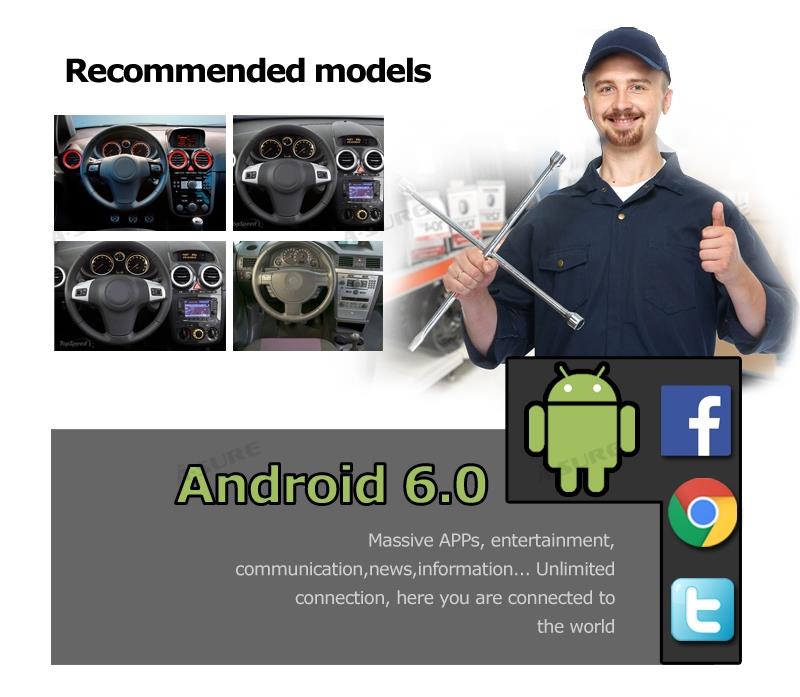 2 Year Manufacturer Warranty + power Harness, Standard Radio Antenna Port + Audio/Video input + Multi Function Socket + Cooling Board, Plug to Play Installation + Android 6.0 + 1228MHz*4 CPU, Quad Core, 1024MB RAM + Dynamic User Interface + Built-in Microphone+ support *DAB+/ Bluetooth BT-Music and PB-Download, Steering Wheel Control, GPS Receiver