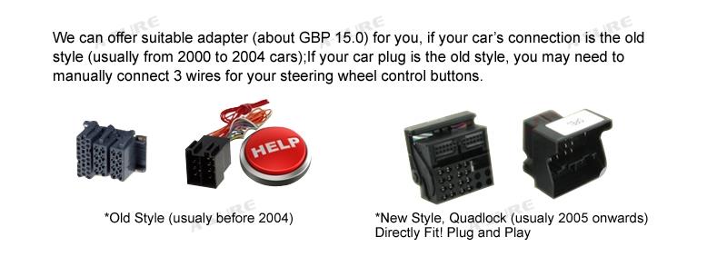 *We provide quadlock harness, if your connection is the old style (usually before 2004), you need to pay extra GBP15 to buy ISO adapter, and you may need to manually connect 3 wires to make your steering wheel control work.