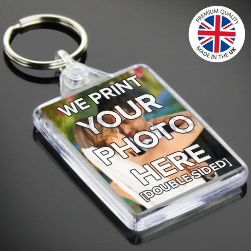 Description: Personalised premium quality double sided clear acrylic photo keyrings with an insert size of 50mm x 35mm. Photos are printed onto 280gsm premium glossy photo paper.