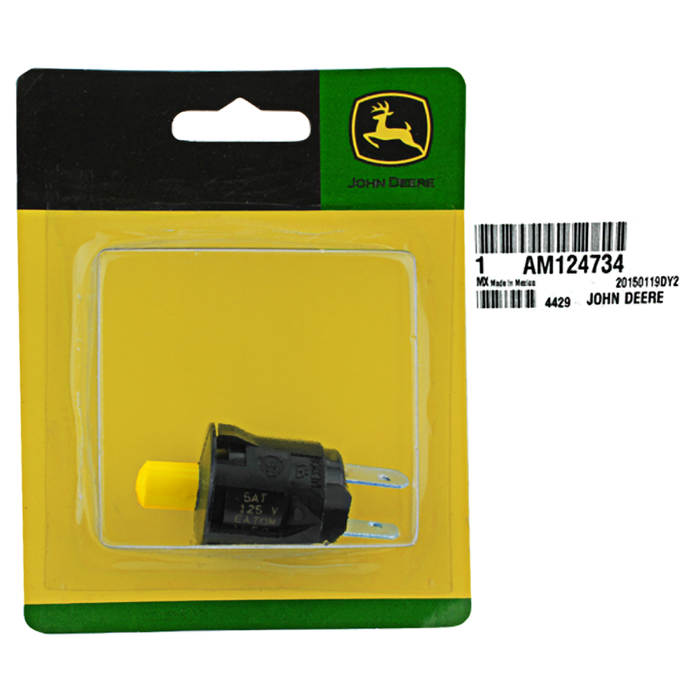 A genuine John Deere #AM124734 RIO Switch. The RIO (Reverse Implement Option) Switch allows cutting blades and implements to continue running while tractors equipped with this feature are running in reverse. Original Equipment (OEM) part.