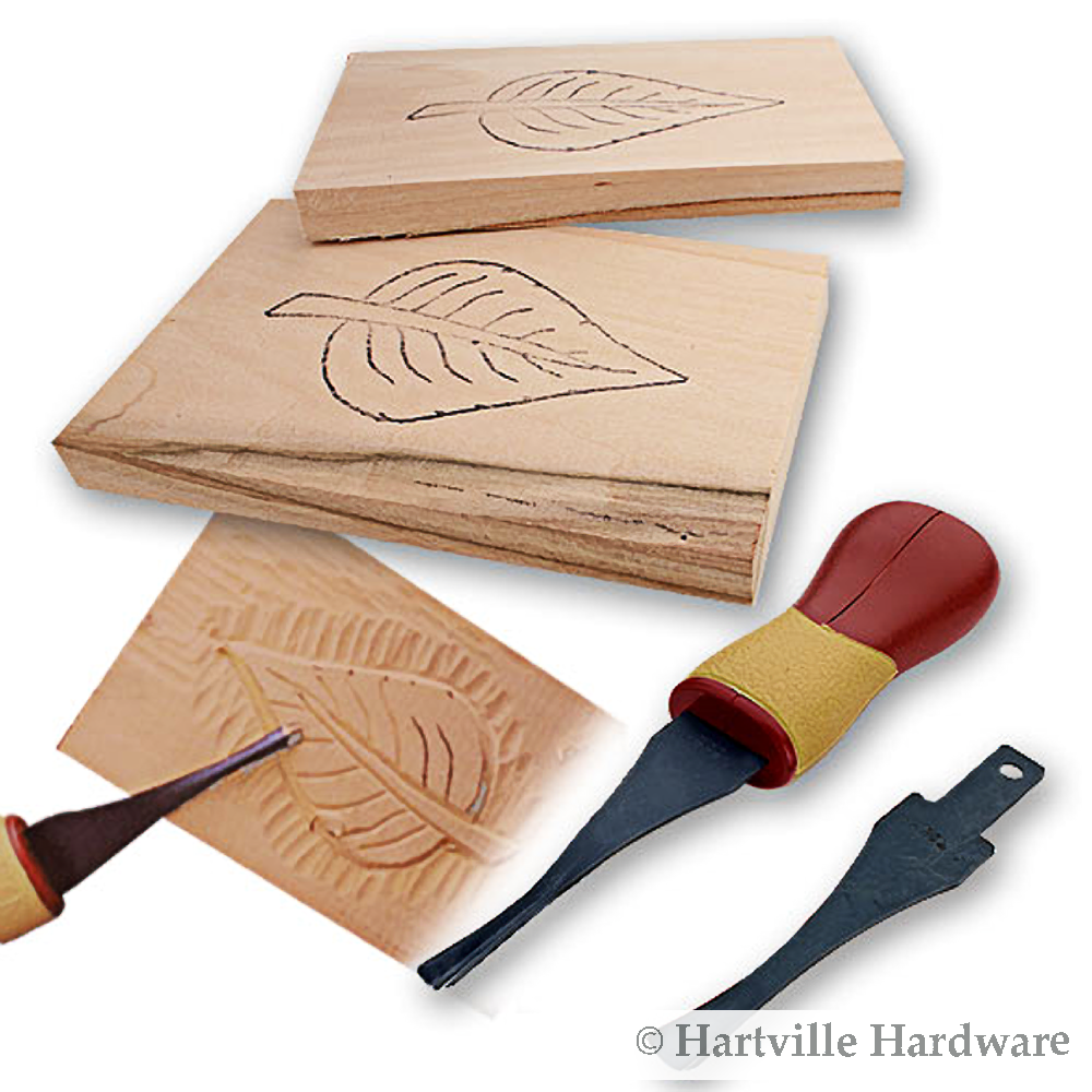 This Craft Carver Set from Flexcut has everything a new carver needs to tackle a first time project. This super user friendly set comes with 2 carving blades - a V-Tool and a Gouge - plus an interchangeable ABS handle. A basswood blank for the leaf carving project and a second blank for practicing cuts are also included. Plus it also comes with a leaf project DVD with step-by-step visual instructions, as well as a 24 page manual that outlines the leaf project and provides maintenance and safety tips for beginners. The carving blades (#'s SK306 and SK307) are made from Flexcut's renowned high-carbon steel for superior edge holding ability.