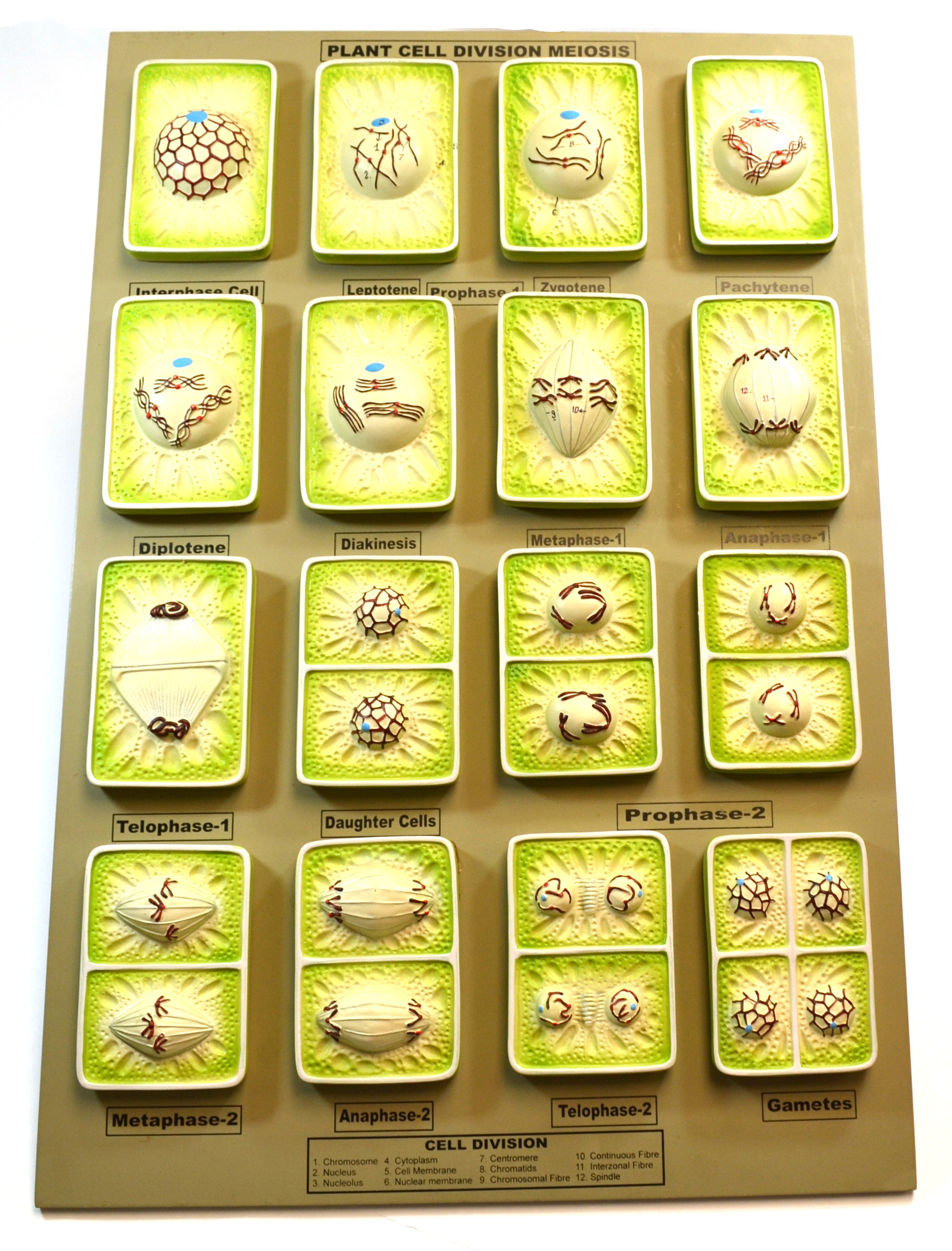 This model is a 3D rendering of the process of meiosis cell division in a plant cell. The model is made of tough fiberglass molded cell models on a sturdy MDF backboard and has clearly labeled phases. The cells are shown in great detail with vibrant colors and provide an internal view of the chromosomal shifts that occur throughout the process of meiosis in a plant cell.