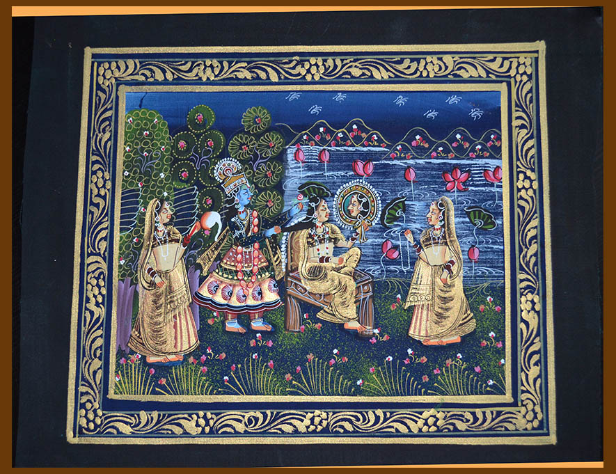 Krishna and Radha as eternal lovers are portrayed rejoicing the moments of love while Radha is getting ready and Krishna is putting flower in her hair near a pond full of lotuses. Gopis(female friend of Krishna) are around them. The depiction of minutest details with sheer perfection celebrates the eternal love of Radha and Krishna. A pearl necklace around the neck and other ornaments adorning ears, nose and forehead make them look lovely. A garden with pond which has lotus and flowering trees are making this scene more romantic.