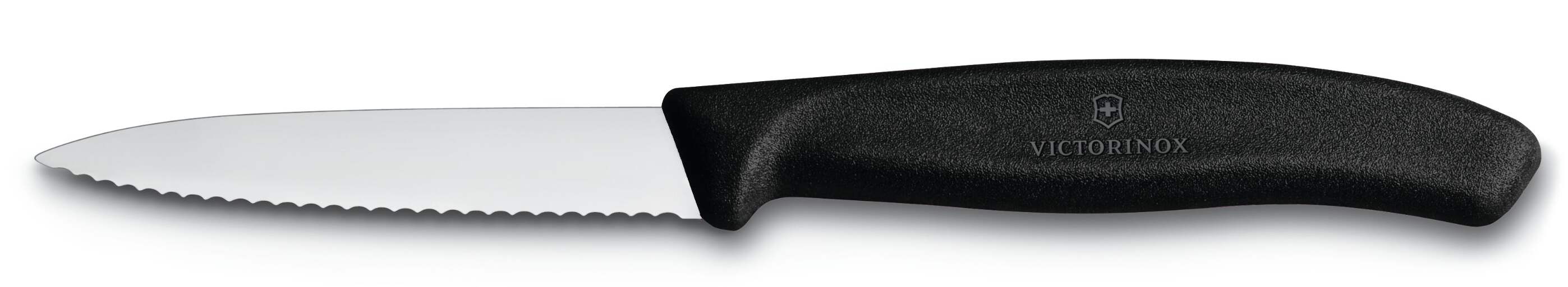 New VICTORINOX Paring Knife Serrated / Wavy Edge Pointed Tip 8cm Swiss ClassicFeatures:     Made of stainless steel and polypropylene     Made in Switzerland     Dishwasher safe     Lifetime warranty against manufacturing faultsSpecifications:    Blade Type:  Serrated    Blade Length: 8 cm    Handle: Polypropylene    Colour: Green / Red / Black / Pink / Yellow / Orange    Origin: Switzerland    Cleaning/Care: Dishwasher Safe    Warranty: Lifetime against manufacturer's defects