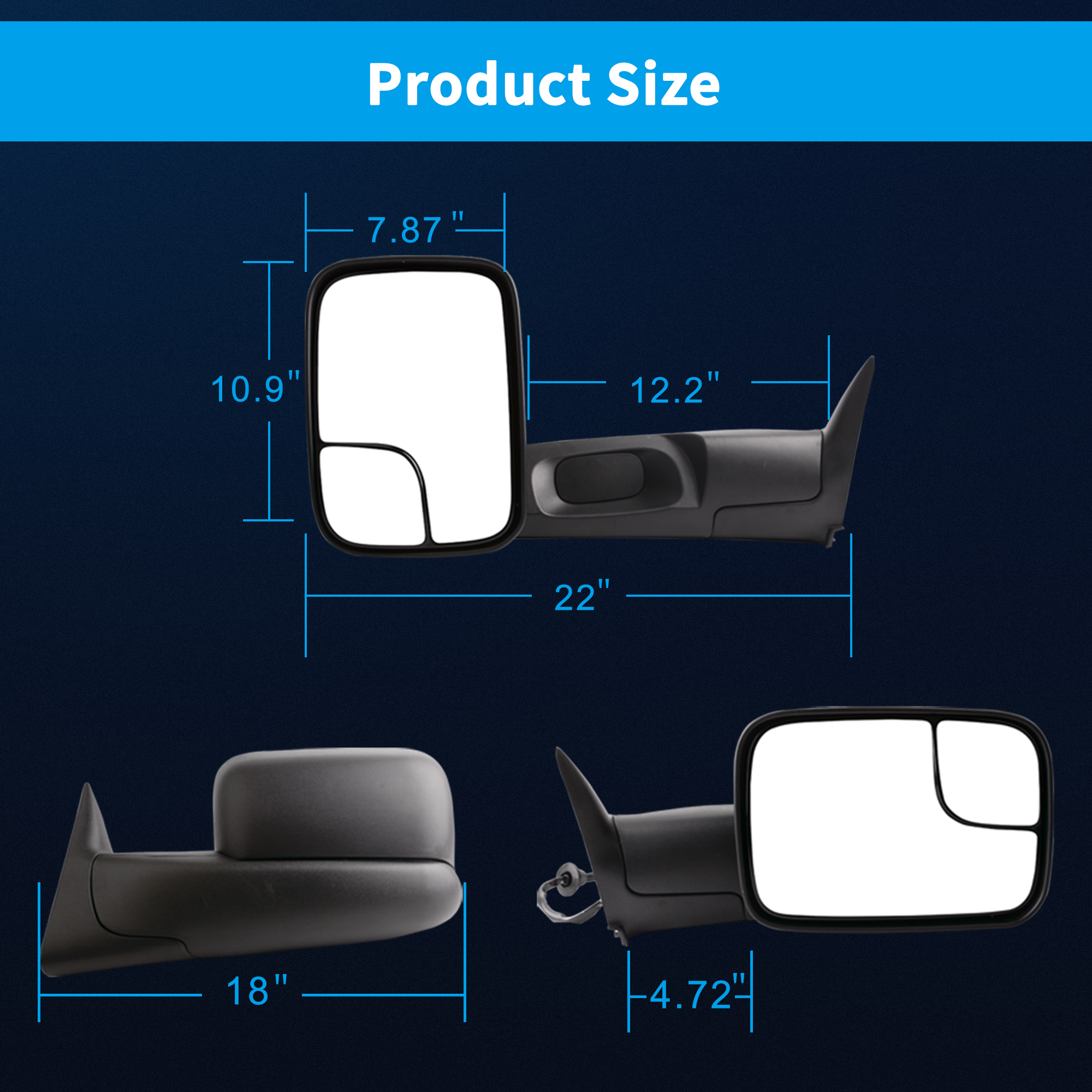 -Mirror length is approximately from 18"(closed) to 22"(flip-up)