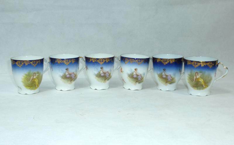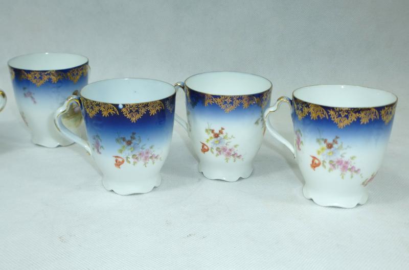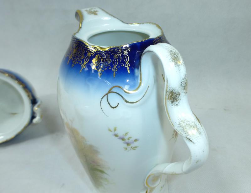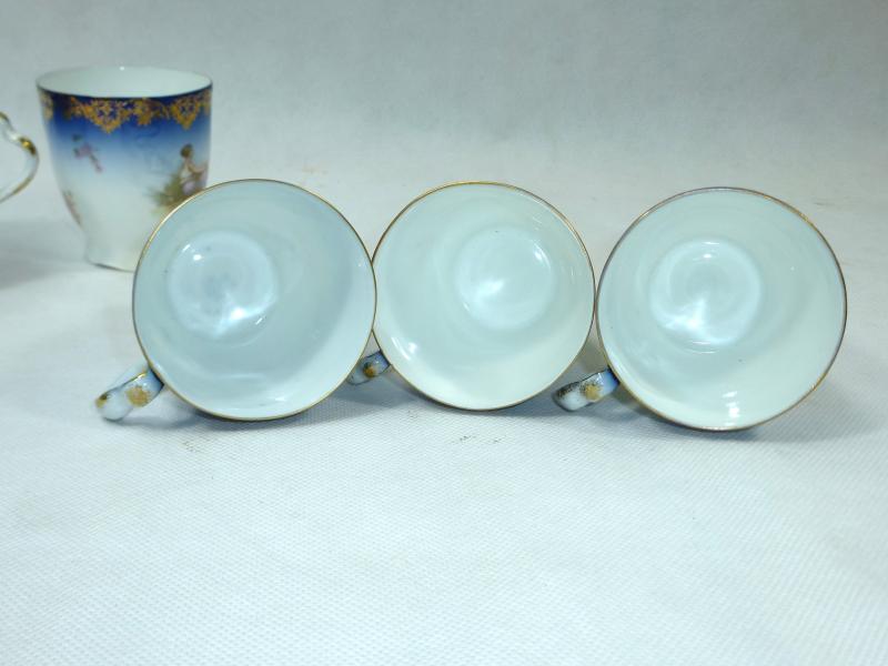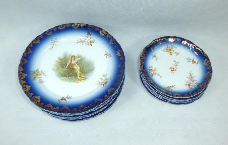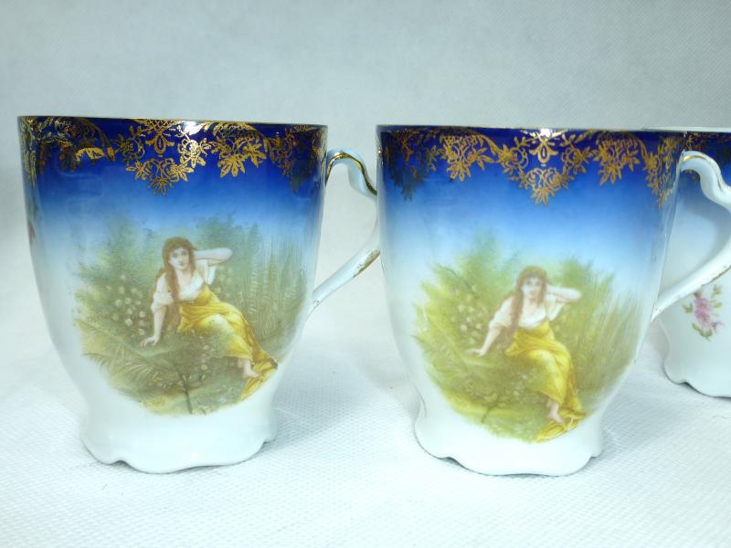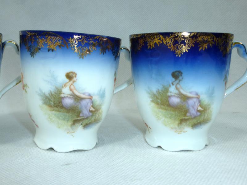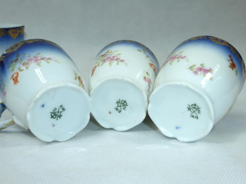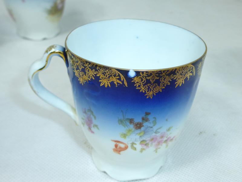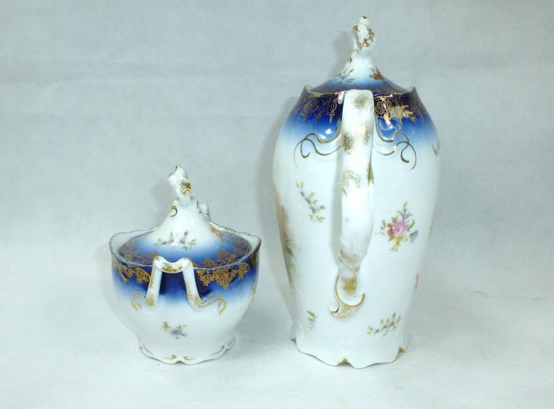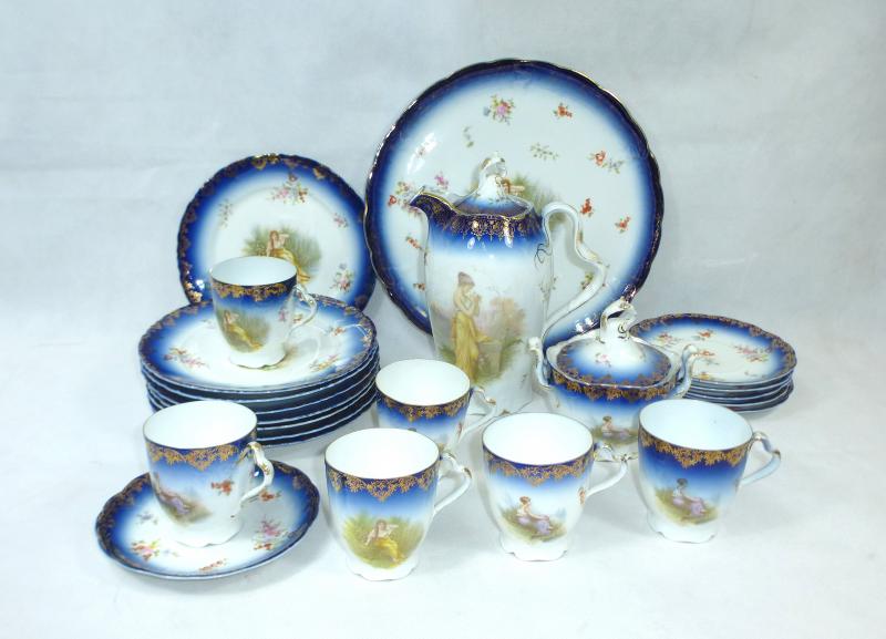 Service, Rosenthal, Ende XIX Jh. Maße: Kaffeekanne: ca. 22,5 x 17 x 10,5 cm. Zuckerdose: ca. 13,5 x 13,5 x 10,5 cm. Tassen: ca. 9,5 x 8 x 7 cm. Untertassen: ca. 15 x 2 cm. Teller: ca. 20 x 2,5 cm. Guter gebrauchter Zustand, altersbedingte Gebrauchsspuren, Vergoldung partiell abgerieben, kleiner Chip an einem Tassenrand, an einem Deckel,eine Untertasse geklebt (siehe Fotos)