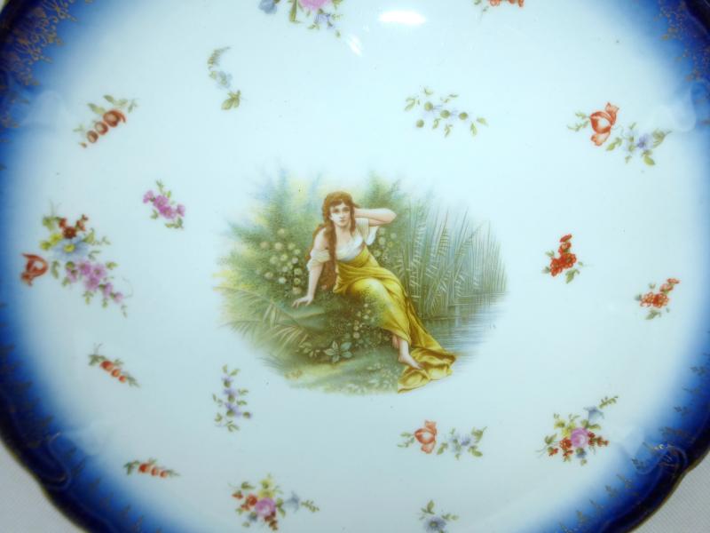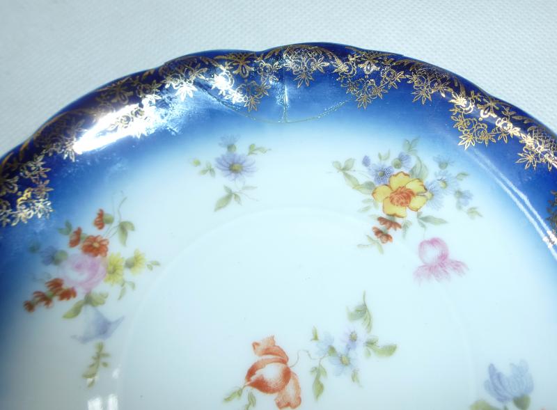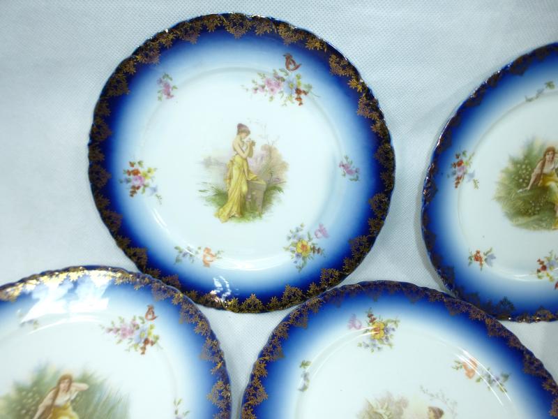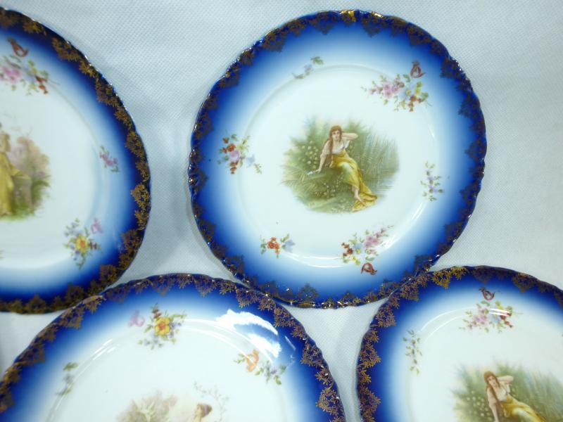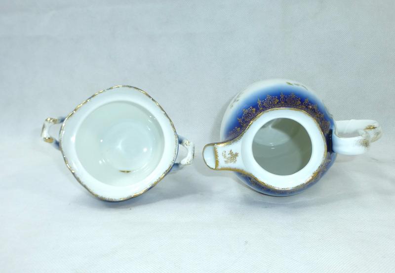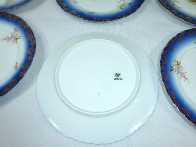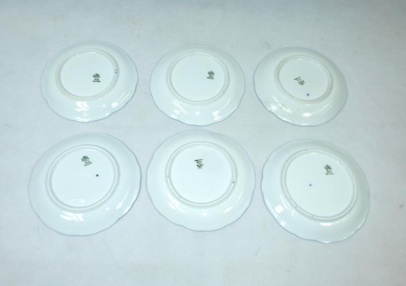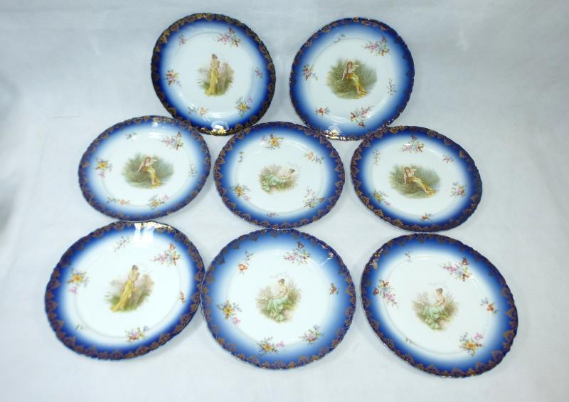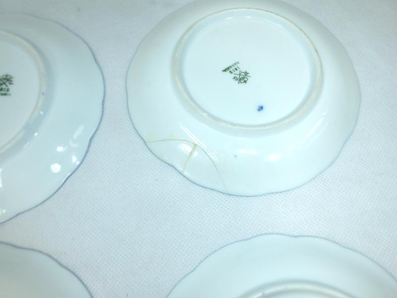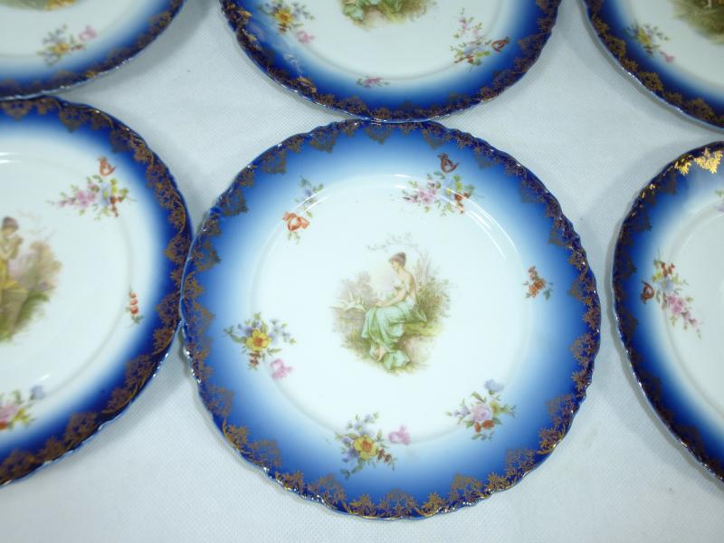 Service, Rosenthal, Ende XIX Jh. Maße: Kaffeekanne: ca. 22,5 x 17 x 10,5 cm. Zuckerdose: ca. 13,5 x 13,5 x 10,5 cm. Tassen: ca. 9,5 x 8 x 7 cm. Untertassen: ca. 15 x 2 cm. Teller: ca. 20 x 2,5 cm. Guter gebrauchter Zustand, altersbedingte Gebrauchsspuren, Vergoldung partiell abgerieben, kleiner Chip an einem Tassenrand, an einem Deckel,eine Untertasse geklebt (siehe Fotos)