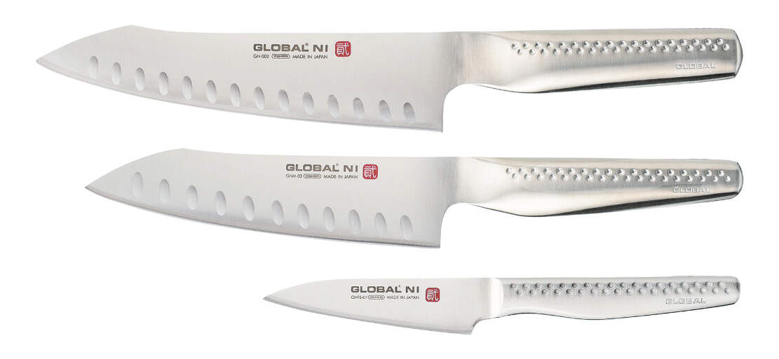 New GLOBAL Ni 3 Piece Kitchen Knife Set Cooks Paring Vegetable GN-3004This 3-piece set combines our most popular knives allowing you to complete a variety of tasks in the kitchen.The Ni collection has everything you would expect from GLOBAL; razor sharp edges, CROMOVA 18 stainless steel and our famous perfectly weighted hollow handles. The Ni Collection features thicker blades with slightly longer handles than the Classic collection and a spine that has been slightly rounded to provide control and comfort whilst using a pinch grip.GLOBAL NI knives all feature an oriental styling, with a distinctive kink in the knife blade. The blades are sharpened at a 15-degree angle, to provide an extremely sharp edge and go through an extra sharpening process in the factory.This 3 Piece Kitchen Knife Set Includes:1 x Oriental Cook's Knife Fluted 20cm1 x Vegetable Knife Fluted 16cm1 x Paring Knife 9cmProduct SpecificationsCROMOVA 18 stainless steel blade, edge retains razor sharpness and resists rust, stains and corrosion.Acute 15 Degree Cutting Edge, provides unsurpassed performance and superior edge retention.Ice tempered and hardened to Rockwell C56-C58.Smooth contours and seamless construction eliminate food and dirt traps, offering the ultimate in safety and hygiene.Perfectly balanced handles precisely calibrated to offset the weight of the blade.Lifetime warranty against manufacturing defects.Made in Japan