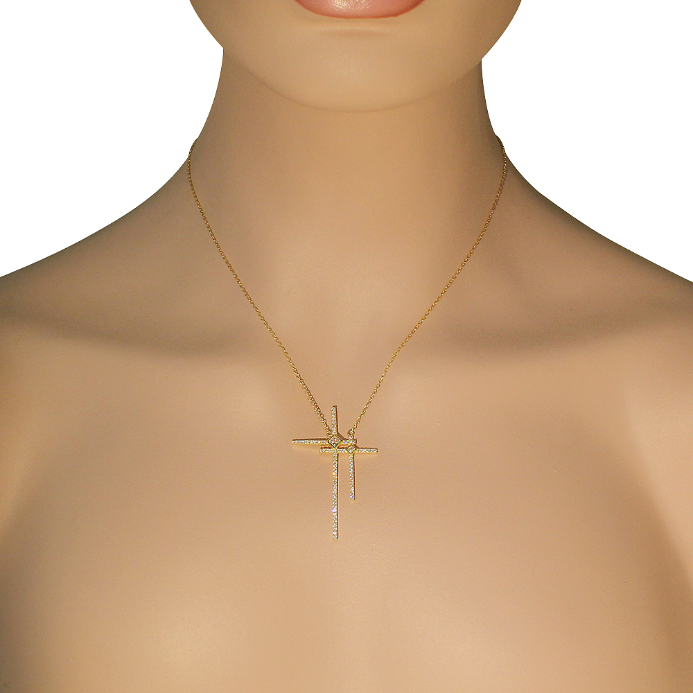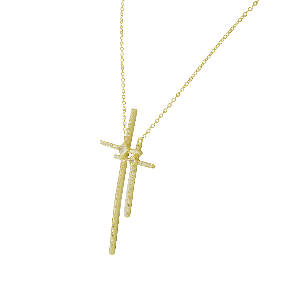 Feature 1: | Quality materials: This golden necklace is made with a sterling silver base accented with gleaming CZ along two crosses. |