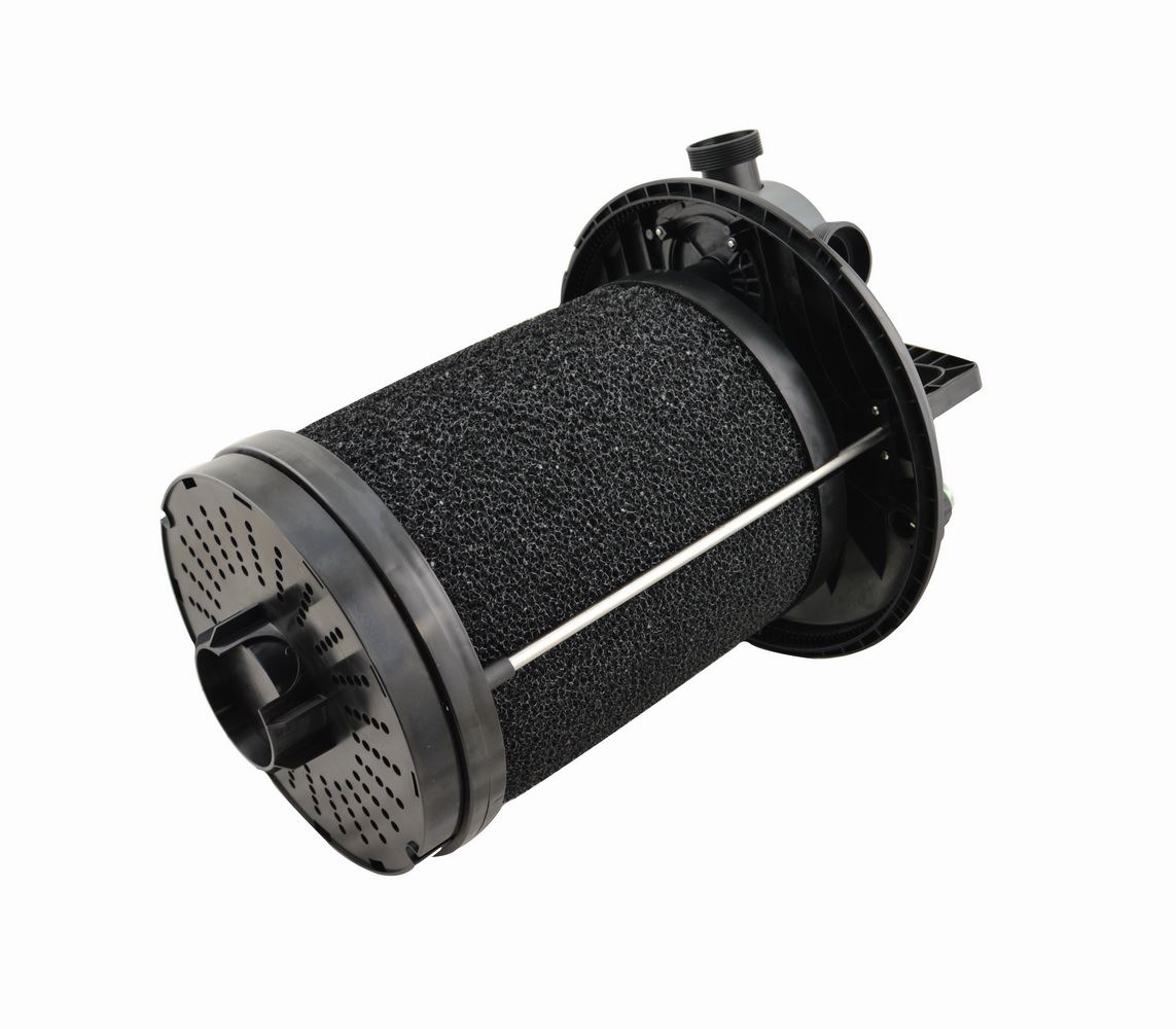 STAGE 1 - Water is pumped in to the filter (pond pump not included) and runs through coarse and fine filter foams to extract floating debris (mechanical filtration).