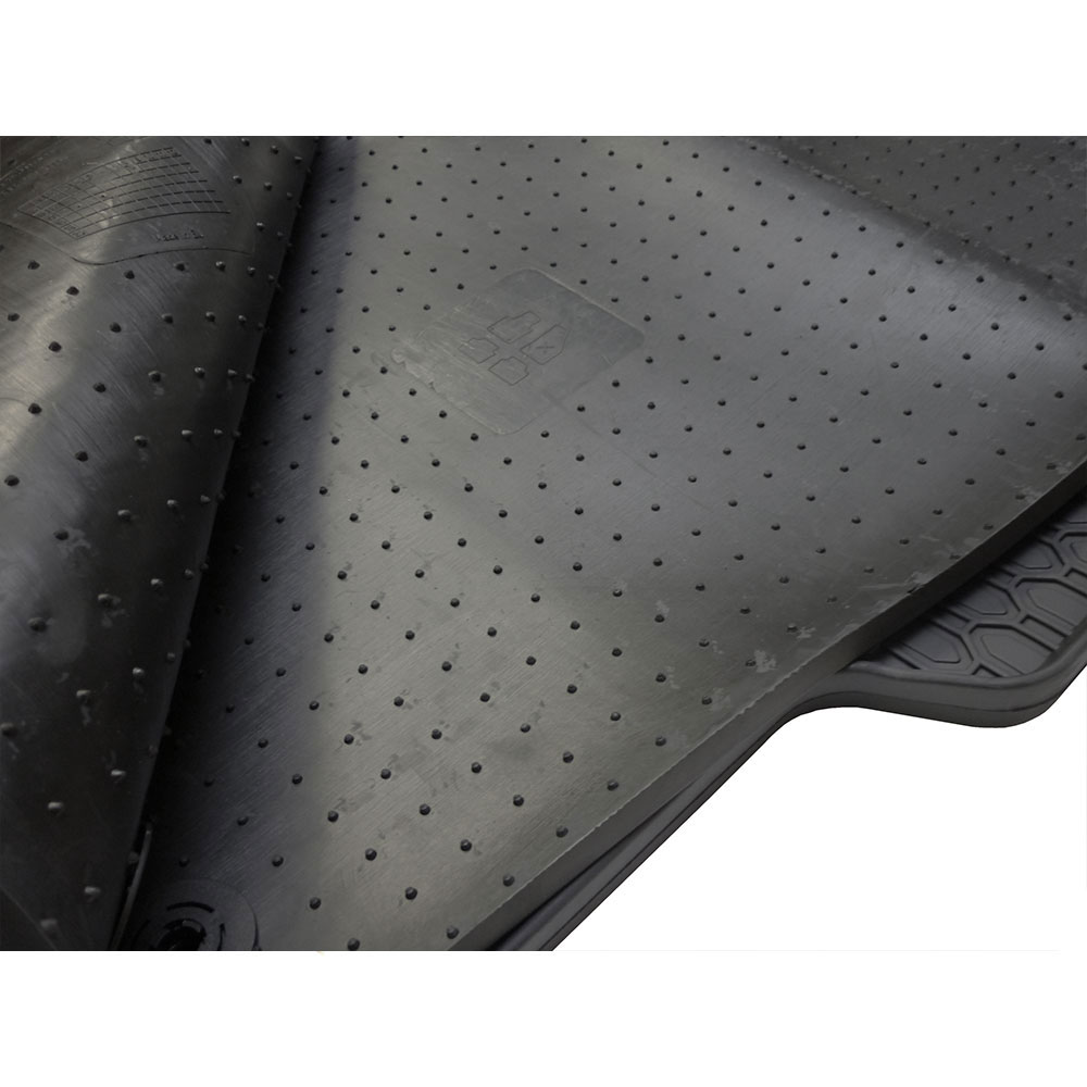 Die Matten besitzen einen ca. 1 cm hohen Rand, der den Innenraum vor Feuchtigkeit schützt. Die Unterseite ist mit Noppen versehen die die Matten zusätzlich zu den Befestigungen vor dem Verrutschen schützen.