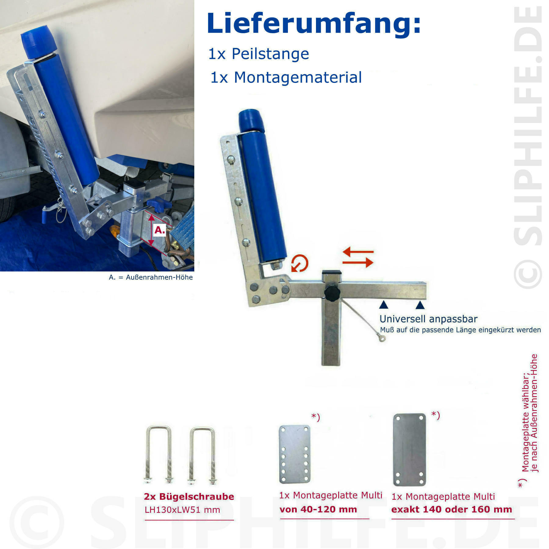Die Peilstange wird am Außenrahmen Ihres Bootstrailers montiert Messen Sie einfach die Außenrahmen-Höhe Ihres Trailers aus und wählen dann die passende Variante aus: