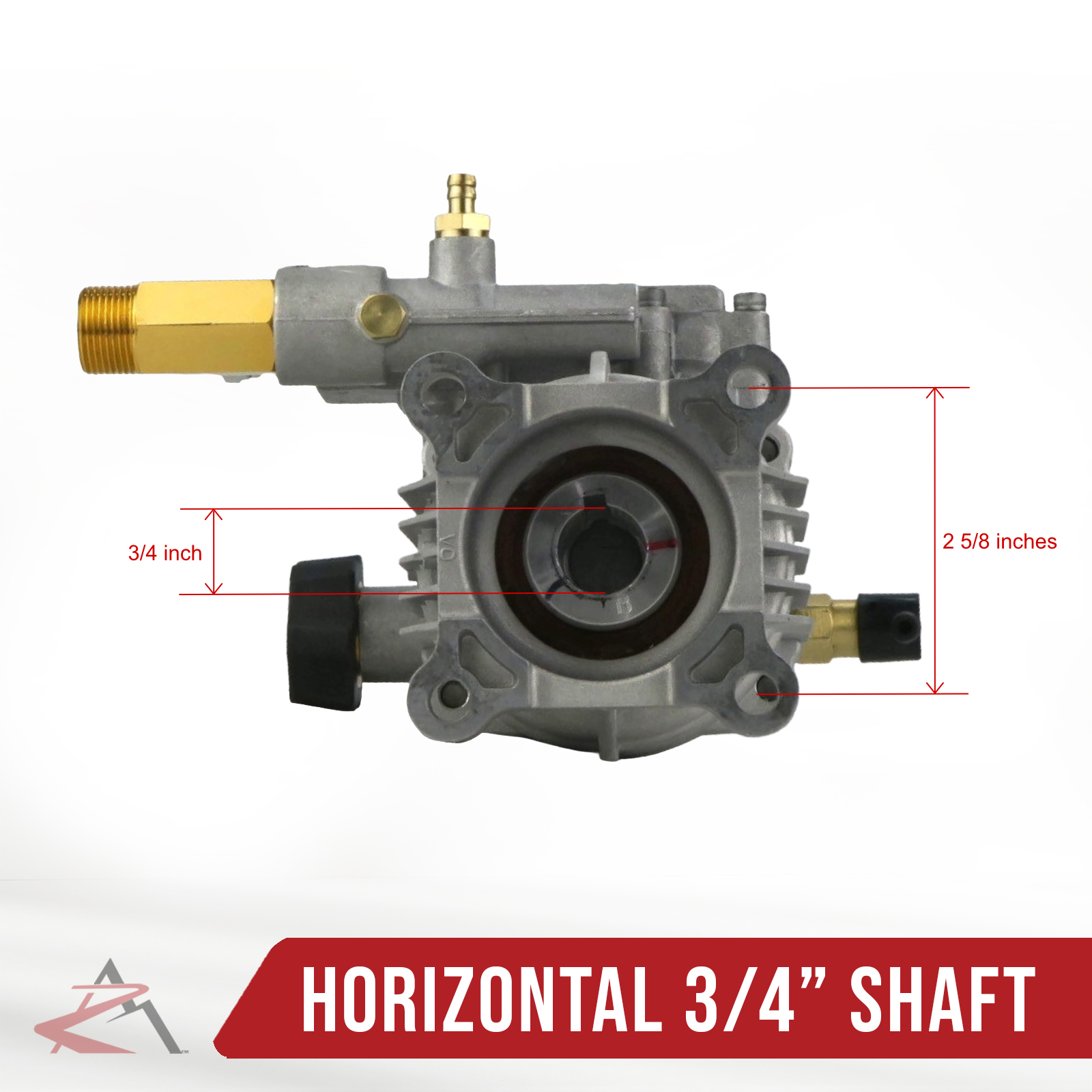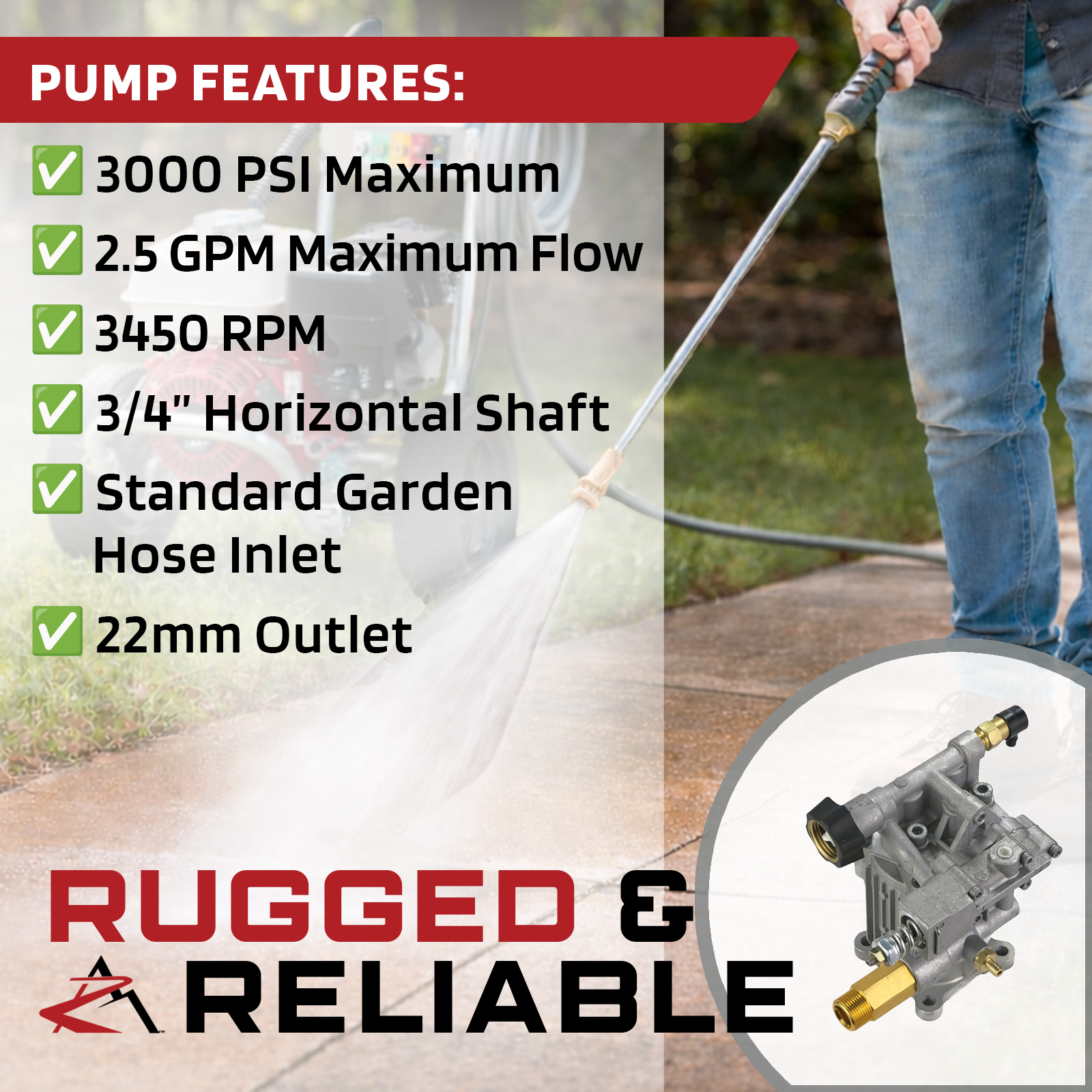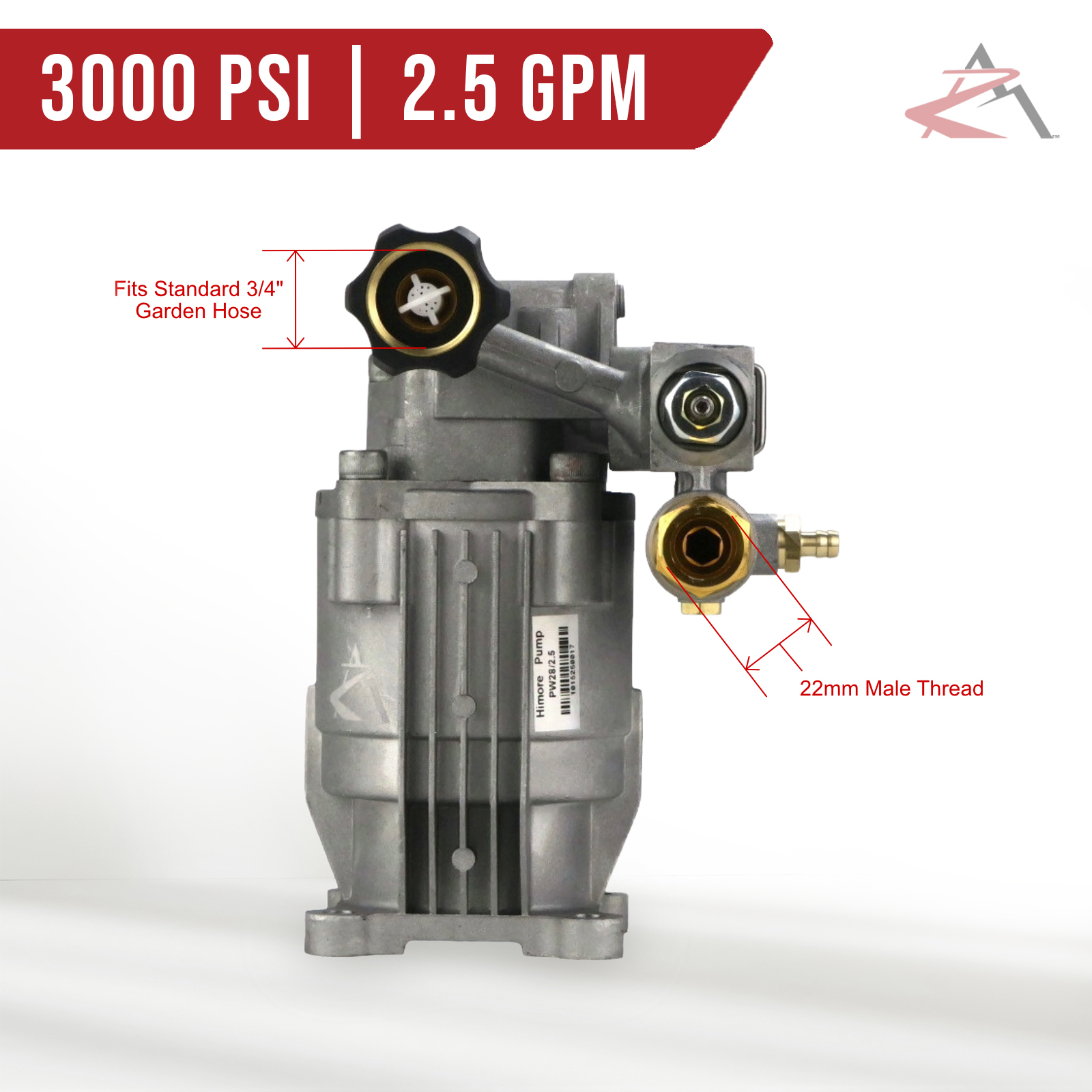 • Specs - Max Pressure: 3000 PSI. Max Flow: 2.5 GPM. Max Pump Speed: 3450 RPM. Shaft Diameter: 3/4" Shaft. 4 Bolt Pattern: 2 5/8" Center to Center between Outer Holes. Max Water Temp: 140° F. Inlet Connection Type: Standard Garden Hose. Outlet Tube Connection: 22mm Male. Refer to images 2 & 3 for more information