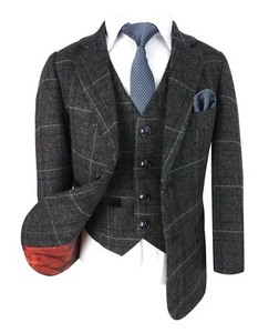While we offer a plethora of boys suits in modern designs, our eye is on the vintage styles as well. As such there will certainly be a time when the retro look is what you need for your child. Our Peaky Blinders collection of boys suits are designed by Paul Andrew, and are on point when it comes to the vintage look that you're looking for. These three suits are made with a premium check tweed fabric in a regular fit size, and the beautiful Paisley lining matches the tie and hankie giving the jacket an elegant look. These suits has a single breasted waistcoat whilst the beige suit has caramel-brown buttons that blend beautifully in the mix. Whether you choose the classy beige suit, or the grey one with the striking red Paisley lining or even the night-themed navy-blue suit, all in all it's a great choice.