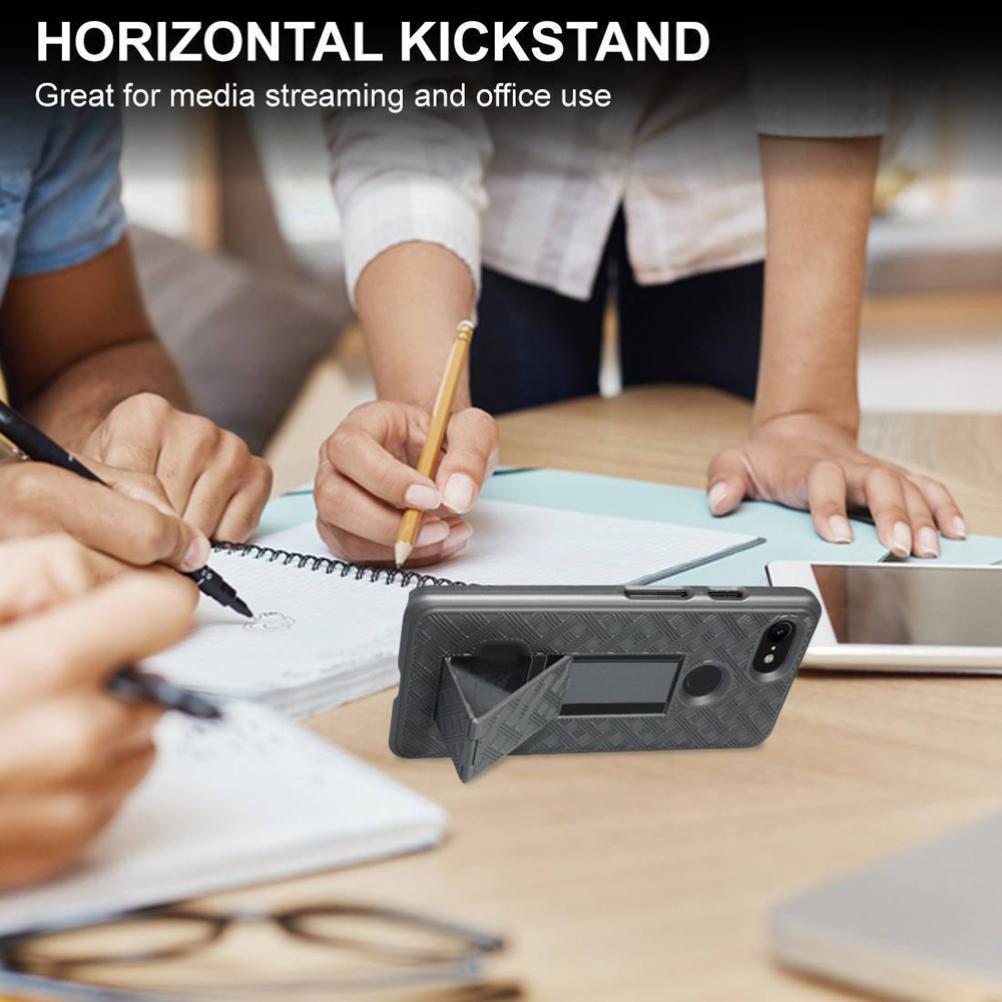 Shell Case Combo Belt Clip Holster Cover w Kickstand Defender Drop Protection [Black]. The high-quality build with its smart design allow you to carry your new Google Pixel 3 (5.5") around easily and comfortably. Slim, stylish design features rugged skin tough enough to handle bumps, scratches and shocks.This swivel holster and rear cover is exactly what you need. Rubberized Swivel Holster with Rear Cover Shell included. Allows your phone to be worn on a waistband or belt and can be taken off of the belt clip without removing it. A locking swivel belt clip is easily locked into an extended position and provides different viewing angles while watching movies or video calls, also rotatable 180 degrees. The case can be also be used with holster or as a separate, slim carrying solution. Advanced locking mechanism securely holds phone in place. Precisely cut to preserve full use of volume buttons, charger, camera, microphone, headphone jack, and all other ports.