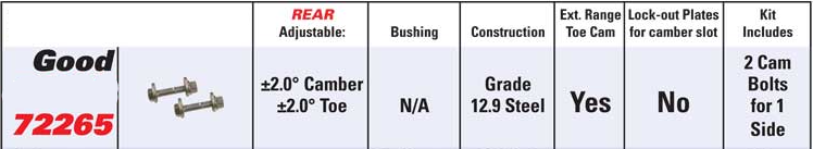 The 72265 Rear Kit offers adjustment for the Infiniti G35. These cams replace the OE camber and to adjustment cams and provide additional camber (±2.0°) and toe (±2.0°) changes. Adjustment slots will need to be elongated using the 85130 (sold separately ) rotary file set or equivalent. This is the perfect kit to adjust rear alignment angles for optimum handling and maximize tire life.