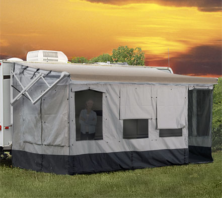 This lightweight room is specifically designed to fit the Carefree 12v Eclipse and Travel'r as well as all brands of traditional patio awnings. Set-up is fast and easy with Carefree's Vacation'r room design. There are no poles, rafters or permanent fasteners to attach to your coach. Features include multi-setting privacy panels, ground stakes, tall skirting for the open areas under the RV and a zippered tote-style storage bag. See your dealer for availability and pricing.