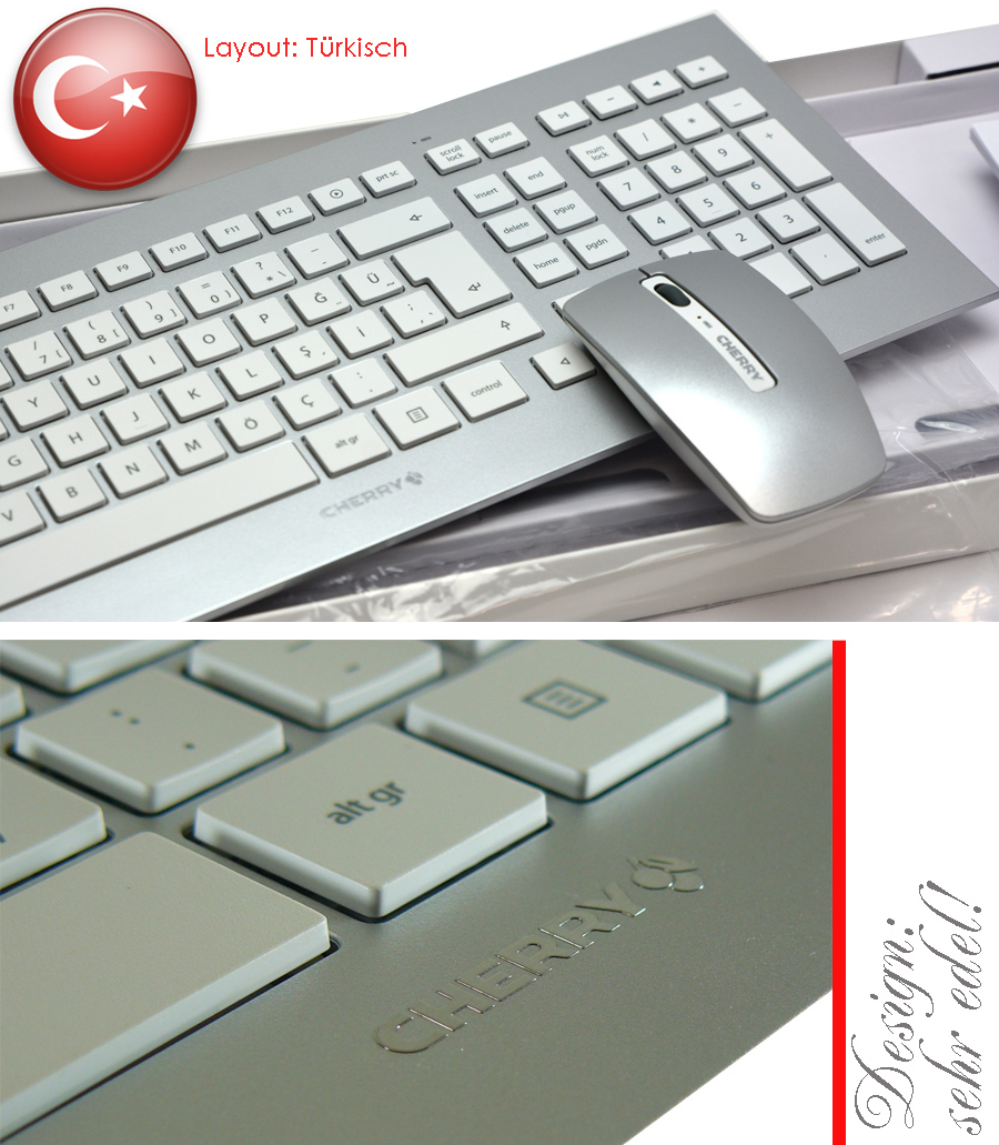 Das Wireless-Desktop-Set DW 8000 gibt sich puristisch-elegant, wie man es von ebenso zeitgemäßem wie zeitlos schönem Produktdesign erwartet. Das Set aus kabelloser Tastatur und Maus macht sich gut neben edler PC-Hardware auf Glas-Bürotisch & Co. Beim DW 8000 vereint CHERRY gewohnt perfekte Funktionalität mit erstklassigem Design. Die ultraflache Tastatur und die symmetrische Maus erfreuen Augen und Hände bei Arbeit und Freizeit am PC.