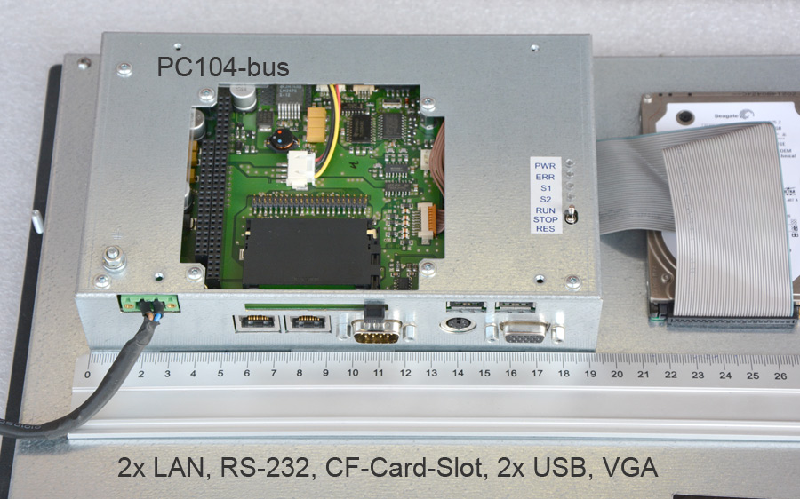 Anschlüsse: VGA, PS/2, RS-232, 2x USB, 2x LAN 10/100, CF-Karte (intern), PC104A-Interface.