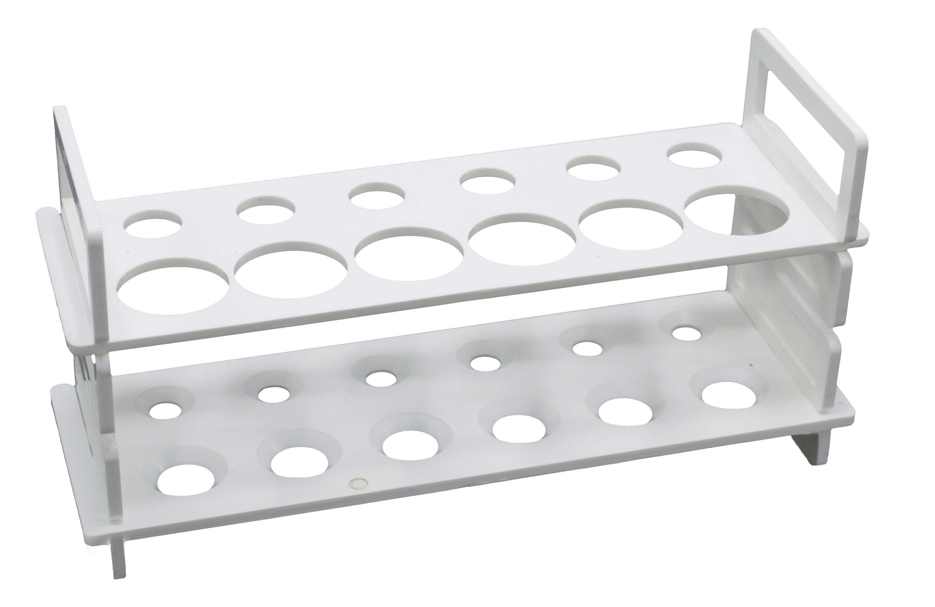 12 Hole Test Tube Stand - Holds (6) 30 mm Diameter and (6) 15 mm Diamater Test-Tubes, Made of Polythene. The stand ships flat packed and can be quickly assembled. The ability to assemble and disassemble makes it easier to clean.
