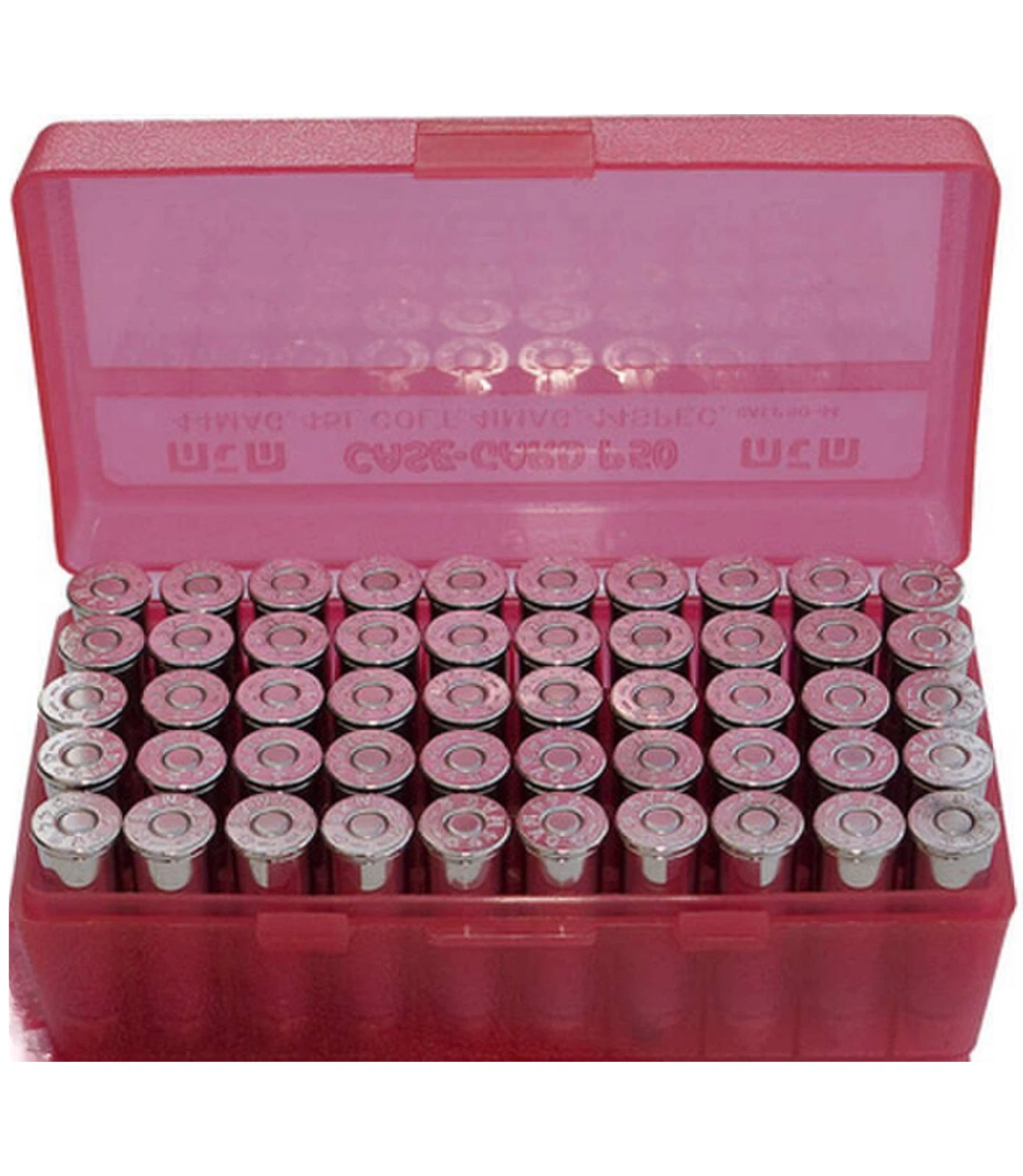 Store your handgun ammunition securely and conveniently with the MTM Case-Gard P509M29 50-round flip-top ammo box. This compact, clear red storage solution is engineered for popular calibers including 9mm Luger, 380 ACP, 32 S&W, 30 Luger, and 9mm Makarov (max OAL 1.23"), letting you quickly spot contents at a glance while keeping rounds protected and organized for range days or safe storage.