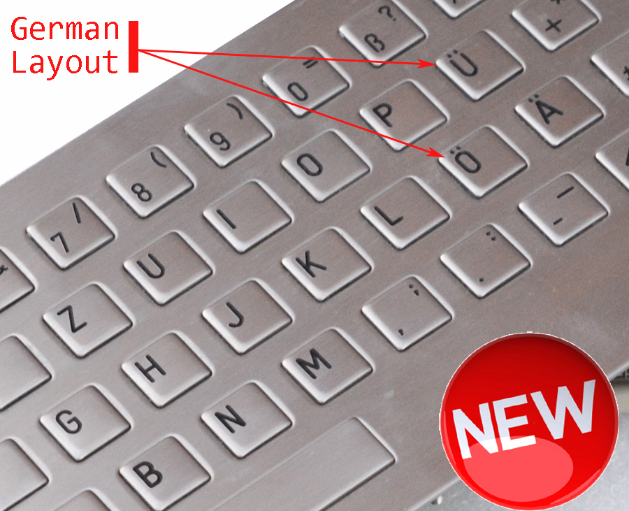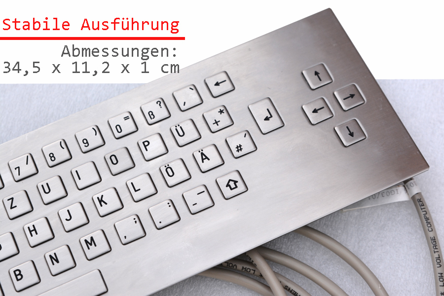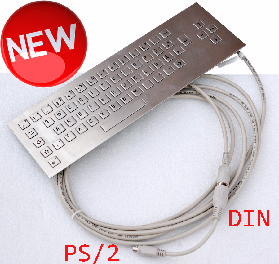 Stainless steel keyboard with racon key caps - Made for banks, information terminals and industrial machines. Robust keyboard with din (AT) Connection and adapter on PS/2.