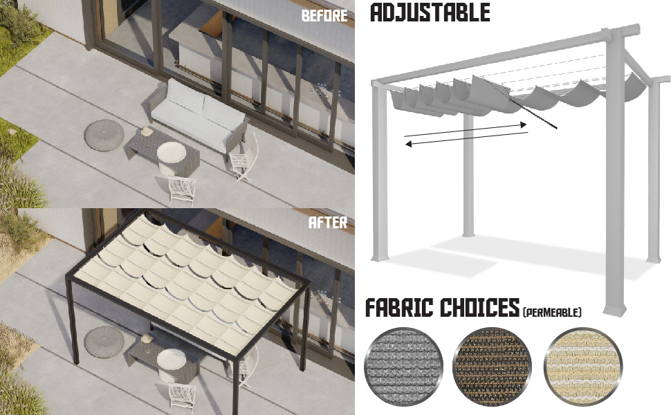 - RETRACTABLE SHADE COVER: This retractable shade canopy will allow you to extend or contract it according to your demand for sun or shade. Ideal for your pergola, patio, deck, yard and more!