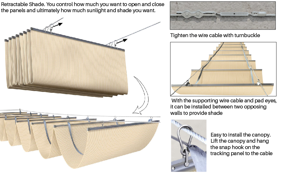 - EASY TO INSTALL: Package comes with all parts required for installation. Our shade canopy is easy to install with supporting wire cable and pad eyes. Attach the shackles and carbineers to the pre-drilled hole on the hanging rods and lift the canopy and hang the carbineers to the wire cable on each side and it is super convenient for you to take it down when strong wind or heavy rain approaches. If you miss any part, please feel free to contact us.