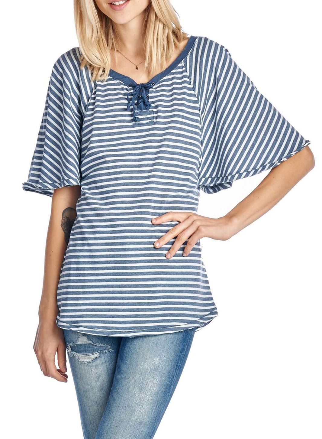 UNION BAY WOMEN'S LACE-UP TOP FLUTTER SLEEVE S/S STRIPED IN TWILIGHT 'S' MSRP32
