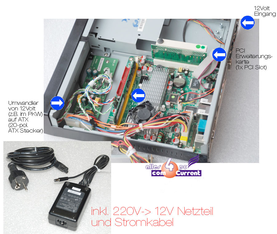 in the small black housing 29x27x6.5cm. The scope of delivery includes external 220V-> 12V power supply and cables, like from a notebook. Internal converter from 12V DC all the currents that an ATX board needs. This means that this computer can also be fed with electricity from the 12V battery or in car/boat.