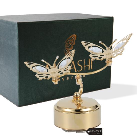 As butterflies frolic in the midday sun, fluttering through the garden and alighting briefly on delicate flowers, we are reminded of the fragility of life, the transformations we go through, and the feeling that we should live in the moment. Below, the mirrored base breaks up the light and flashes it prettily around the room as it spins. As it unwinds, the tinkling tune plays out, and with it comes the calm that follows beautiful music. This stunning ornament is crafted with quality materials like 24K Gold and decorated with authentic precision cut crystals. A true musical delight, give it as a unique gift or use it as an elegant, calming decoration!