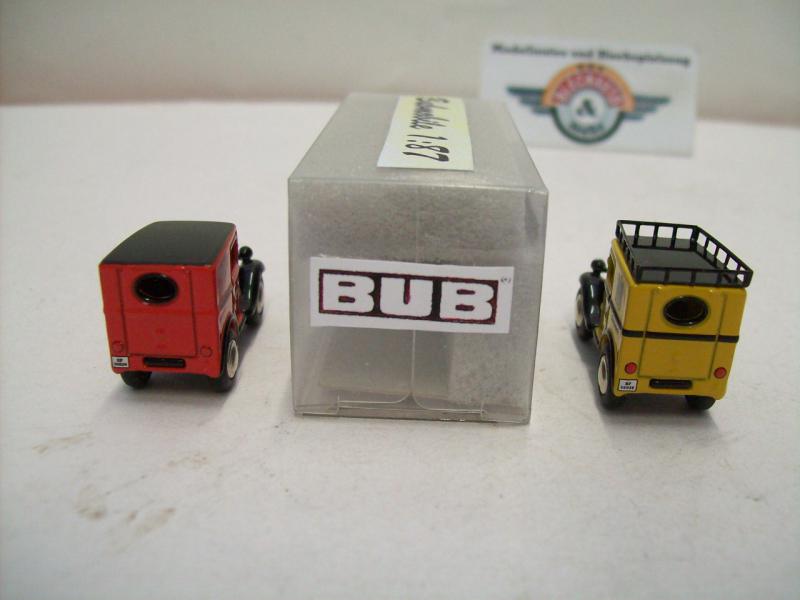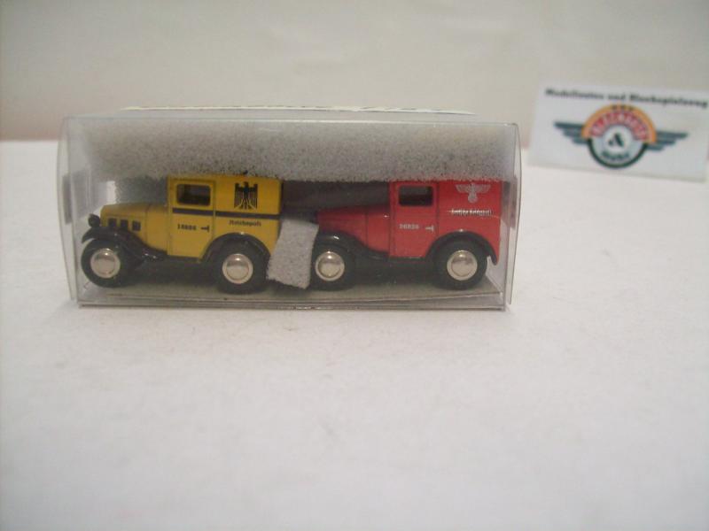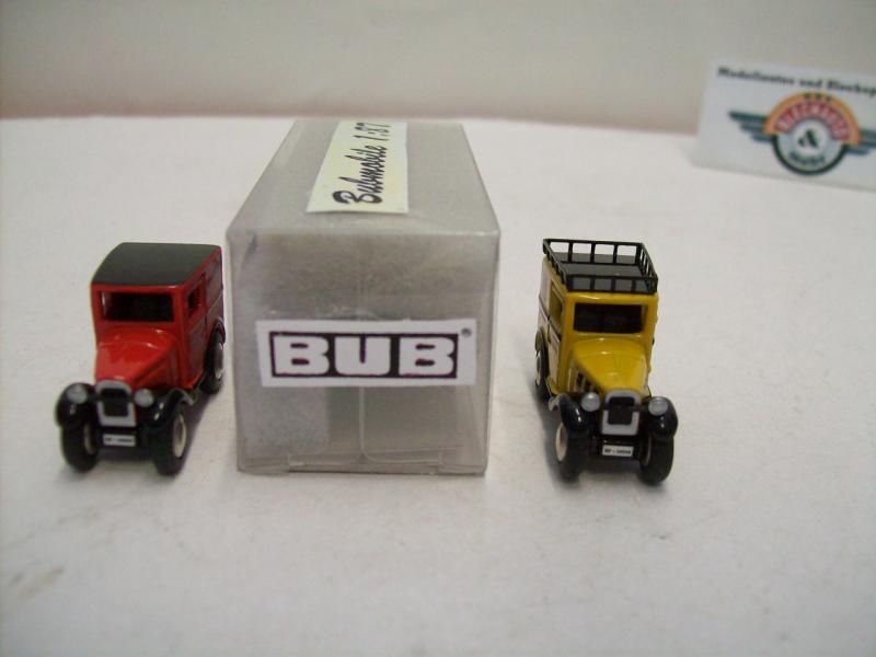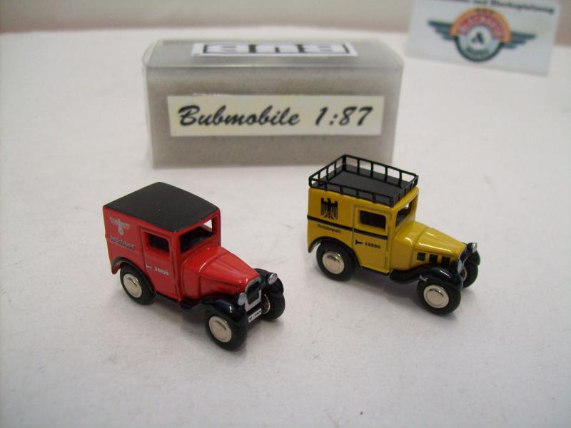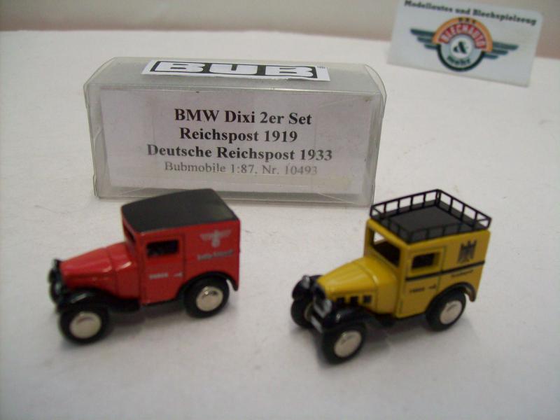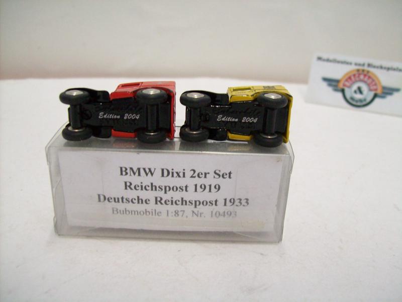 2er Modelauto-Set BMW Dixi "Deutsche Reichspost / Deutsche Reichspost", 1919 / 1933, gelb/rot, detaillierte Modelle von Bub (Bubmobile), Artikel-Nr. 10493, Maßstab 1:87 (HO), neuwertige Vitrinen-Modelle in Box