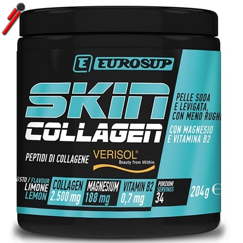 Skin Collagen è un integratore alimentare realizzato con VERISOL®, un collagene di elevatissima qualità sviluppato appositamente per l’utilizzo negli integratori. Completano la formula la Vitamina B2, che contribuisce al mantenimento di pelle e mucose normali e alla protezione delle cellule dallo stress ossidativo, e il magnesio che contribuisce alla normale sintesi proteica e interviene nel processo di divisione delle cellule. Il collagene è il principale componente strutturale della pelle, ne costituisce circa l'80% del peso secco. È noto che le proprietà della pelle sono influenzate da fattori endogeni e ambientali, tra cui invecchiamento, radiazioni ultraviolette, ormoni e nutrizione. Grazie al collagene è possibile sperimentare una pelle più soda e levigata, con meno rughe*.