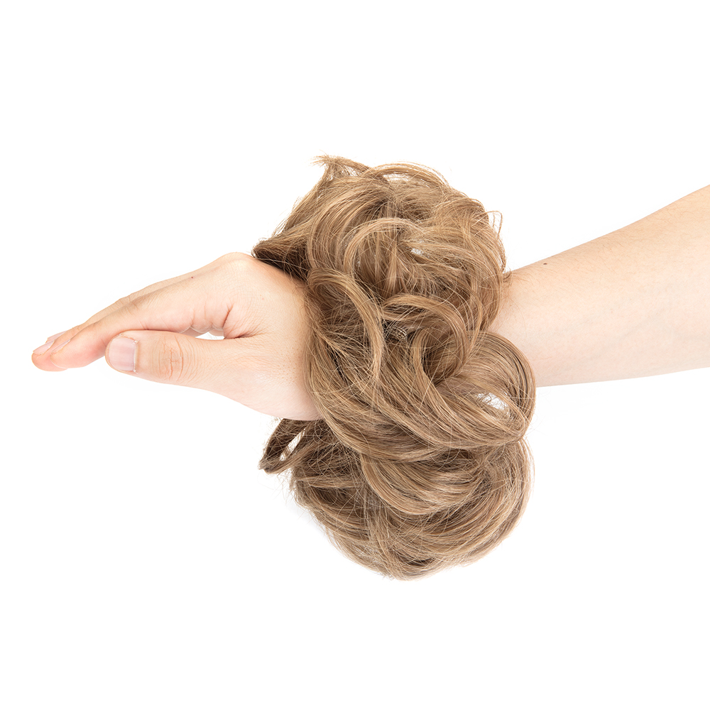 • Messy Wavy bun scrunchy hair: Heat resistance synthetic fiber. completely natural, not shiny, soft and comfortable to wear.Washable but do not use curling irons, blow dryers, or hot styling instruments.