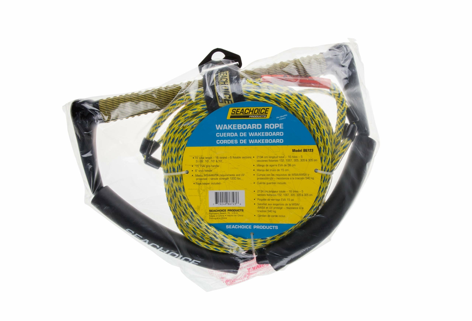 This Seachoice 4-Section Wakeboard Rope provides consistently outstanding towing with sections of 5 feet, 35 feet, 10 feet, 10 feet, and 10 feet. The strong, low-stretch, UV-protected, 16-strand rope has a tensile strength of 1,200 pounds and will deliver sure towing season after season. The rope’s full length is 70 feet. This rope has a 15-inch handle with a dense and durable EVA grip that provides a rider with a sure, comfortable grip. There’s also a 6-inch trick handle that provides the ideal grip and flexibility when executing spins and tricks. It’s easy to store this tow rope in an orderly, tangle-free fashion using the convenient rope keeper that is included. This tow rope meets all WSIA/AWSA requirements and delivers outstanding performance. Seachoice is committed to delivering quality marine accessories and OEM replacement parts to satisfy fishing, boating and watersports enthusiasts worldwide. Seachoice is run for and by boaters, offering a wide-ranging product line while remaining affordable.