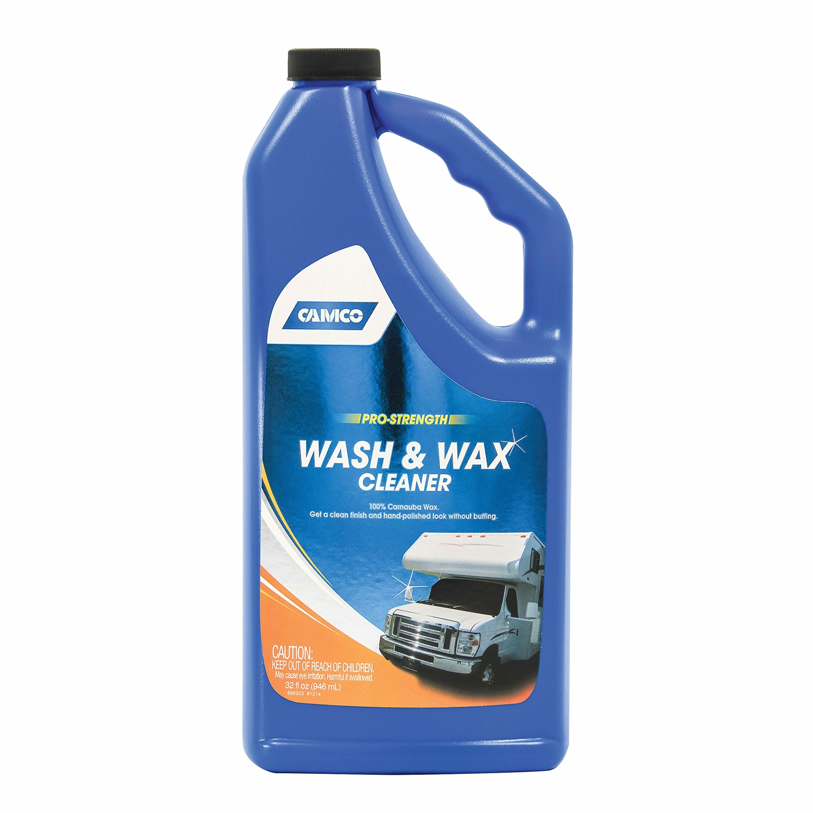 The Camco Pro-Strength Wash & Wax 32oz cleaner is a blend of natural waxes and emulsifiers that will clean, shine and protect your RV in one easy application. Wash & Wax will yield the same waterproof/resistant beading action seen on exhausting hand-polished wax jobs without the need for buffing. Safe for all finishes, this product will give you a beautifully clean RV with a dazzling shine.