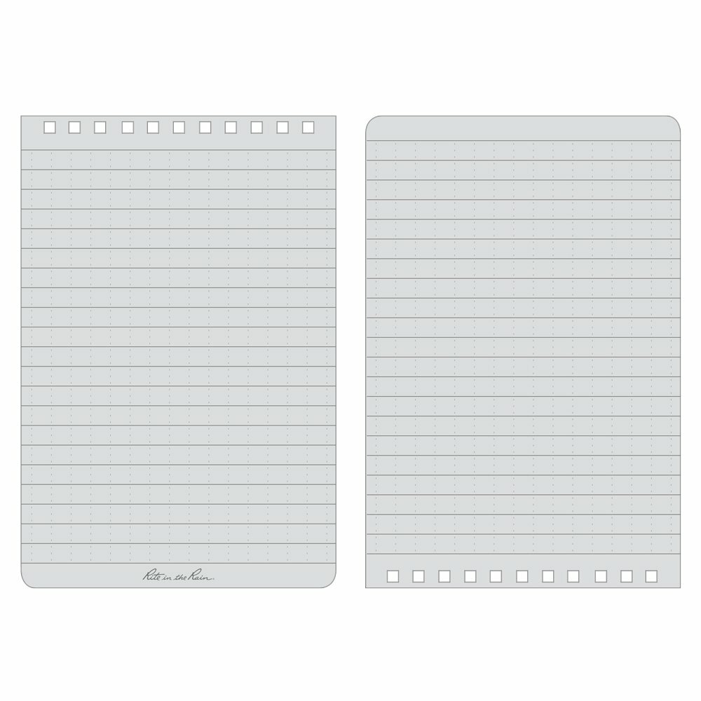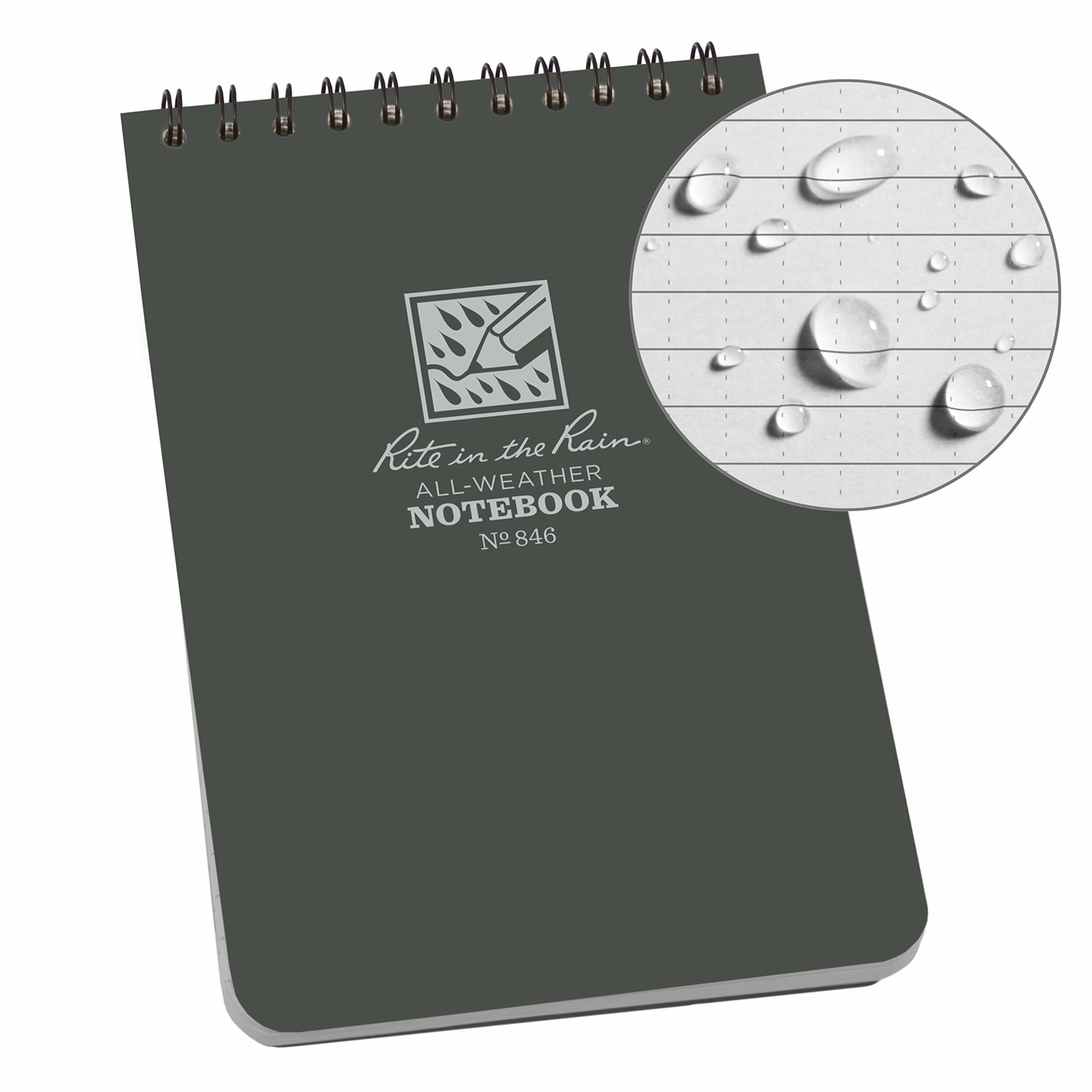 The Gray 4" X 6" Top-spiral notebook is small enough to fit comfortably in your pocket and tough enough to survive any of Mother nature's onslaughts. This scrappy pocket notebook will survive rain, sweat, mud, Snow, oil, and grease. The non-glare white paper is legible in bright sunlight. The impact-resistant Wire-O binding won't lose its shape. The polydura cover defends your notes from scratches and stains. Rite In The Rain All-Weather Writing Products have been made in Tacoma Washington, USA since 1916. Recycle Rite In The Rain paper with standard papers. Recycle the entire notebook using most curbside programs (paper, plastic, & metal). Simply separate the Wire-O from the cover prior to recycling for easier processing.