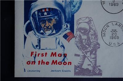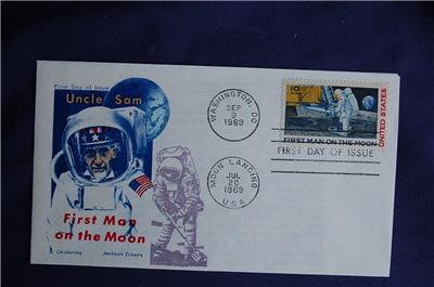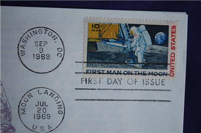 This First Man on the Moon 10c Air Mail Stamp First Day Cover with a beautiful Embossed cachet by Jackson Covers (Overseas-Mailer) was canceled with a Traditional FDOI postmark on September 9th, 1969 in Washington, DC. The cover has a very attractive design. The cover is franked with a 10c AM stamp with a special traditional FDOI cancellation. The cover is in Very fine condition, with no folds or bent corners. This is a beautiful historic cover, a great collectible and keepsake. Thank you for your consideration.
