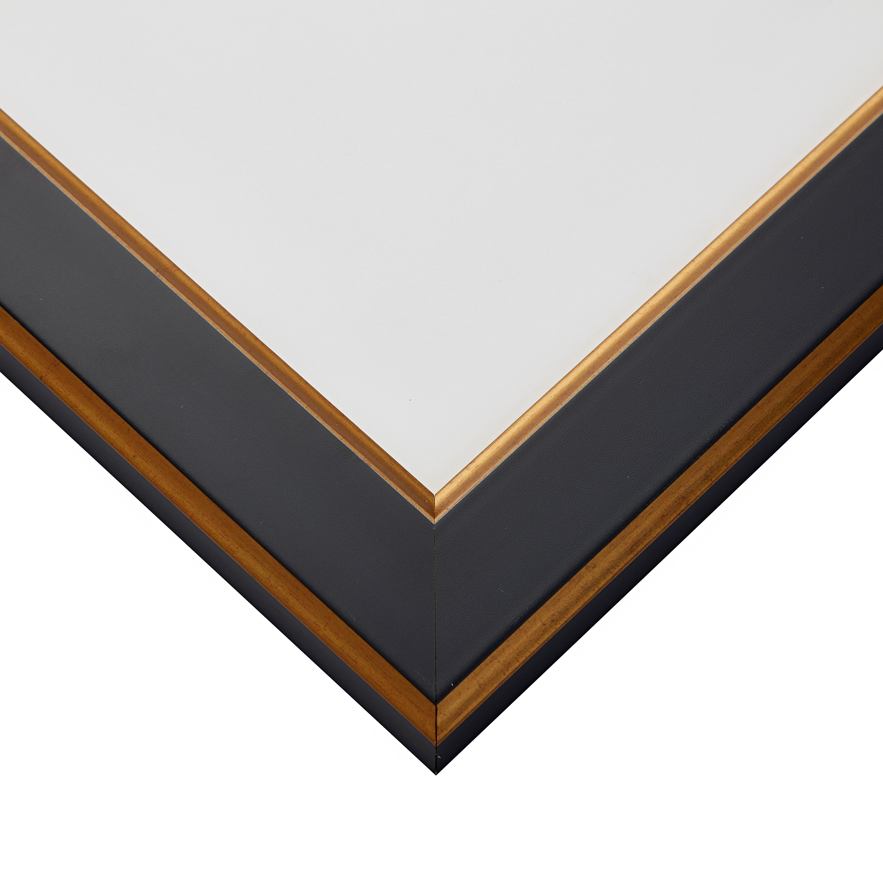 This chic black and gold picture frame showcases a flat black facing with a gold inlay and gold edging. Featuring an MDF wood composite core, the premium wrap of the Crackle picture frame affords a smooth finish and modern appearance of the facing and sidewalls. Clean lines and gold tones allow the Crackle Black and Gold picture frame a place in both modern and vintage décor.