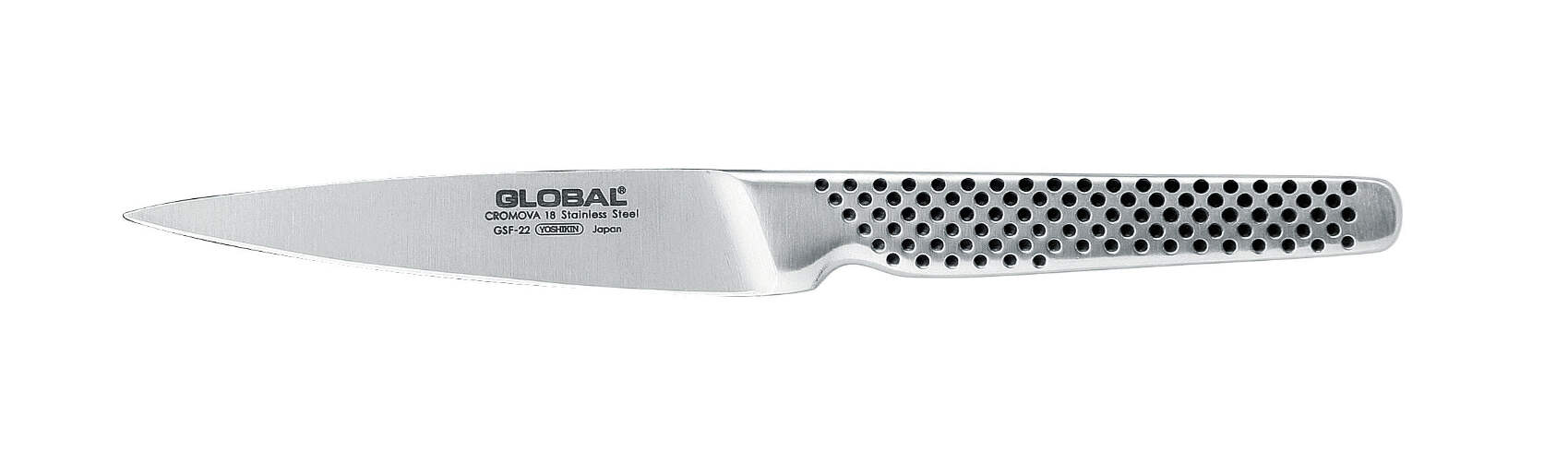 New GLOBAL 11cm Utility Knife Straight Blade Made in Japan GSF-22 Kitchen ParingThis versatile knife excels at everyday tasks and is perfect for small tasks where precise cuts are needed. Utility knives are sometimes called sandwich knives because they work well on almost everything that goes into a sandwichfrom tomatoes, meats and cheeses. Use one of these for tasks where a chef’s knife would simply be too cumbersome.The GSF-22 is made from forged CROMOVA 18 stainless steel, specially developed by GLOBAL as it holds a razor-sharp edge and resists rust, stains and corrosion. Ice tempered and hardened to Rockwell C56-58, each knife is carefully weighted for optimum performance and balance. Other unique features include its smooth contours and seamless construction which eliminates food and dirt traps offering the ultimate in safety and hygiene. The acute 15-degree angle cutting edge provides unsurpassed performance and superior edge retention.Product Features:CROMOVA 18 stainless steel blade, edge retains razor sharpness and resists rust, stains and corrosion.Acute 15 Degree Cutting Edge, provides unsurpassed performance and superior edge retention.Ice tempered and hardened to Rockwell C56-C58.Smooth contours and seamless construction eliminate food and dirt traps, offering the ultimate in safety and hygiene.Perfectly balanced handles precisely calibrated to offset the weight of the blade.Lifetime warranty against manufacturing defects.Made in JapanCare & Cleaning:Periodic sharpening, using either a waterstone or ceramic stone, will maintain the sharpness of the blade.Recommend the use of wooden cutting boards.Hand wash recommended.After washing, rinse thoroughly & dry with a towel.Global Code: GSF-22.Blade Length: 11cm