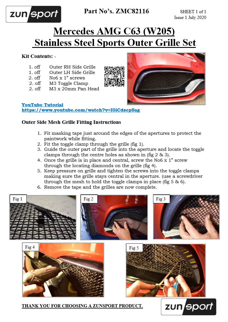 Zunsport Fitting instructions and all fitment clips and brackets are included with each grille. We are committed to making the fitting of your car grille a satisfying element of the ownership experience. A helpline is also available to answer any questions that might arise. Or you can use one of our accredited Fitting Bays (see Distributors)