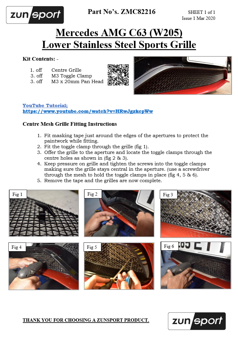 Zunsport Fitting instructions and all fitment clips and brackets are included with each grille. We are committed to making the fitting of your car grille a satisfying element of the ownership experience. A helpline is also available to answer any questions that might arise. Or you can use one of our accredited Fitting Bays (see Distributors)