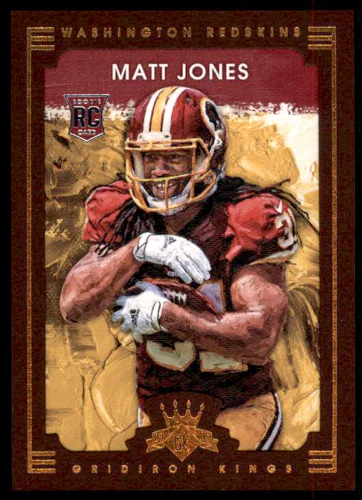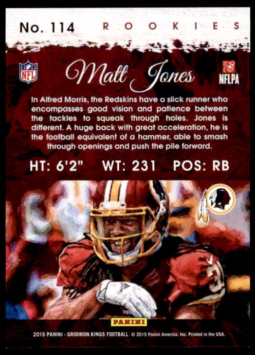 | Description: | Matt Jones | | Category: | Football | | Year: | 2015 | | Product: | Panini Gridiron Kings Brown Frame | | Team: | Washington Redskins | | Card Number: | 114 | | Rookie: | Yes | | Dimensions: | 2¼" x 1½" |
